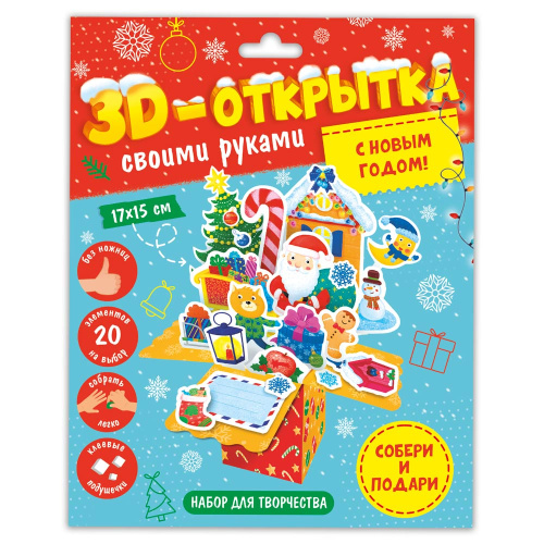 Креативный новогодний подарок – своими руками! В этом наборе для творчества есть всё, что нужно, чтобы сделать необычную 3D-открытку без помощи ножниц: основа для открытки-коробочки, 20 ярких элементов на выбор, клеевые подушечки. Посмотри пошаговую инструкцию, собери и удиви родных и близких оригинальным подарком! Набор для творчества развивает мелкую моторику, воображение и творческое мышление.