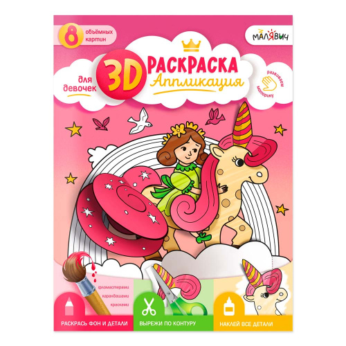 «3D-раскраска-аппликация. Для девочек» под брендом «МалЯвич» – это творческая тетрадь для создания объёмных картин! Внутри 8 картинок принцесс и детали к ним. Раскрасьте, вырежьте, приклейте – и полюбуйтесь результатом! Готовые картины можно подарить друзьям, украсить ими комнату или устроить выставку. Рекомендовано для детей дошкольного возраста.