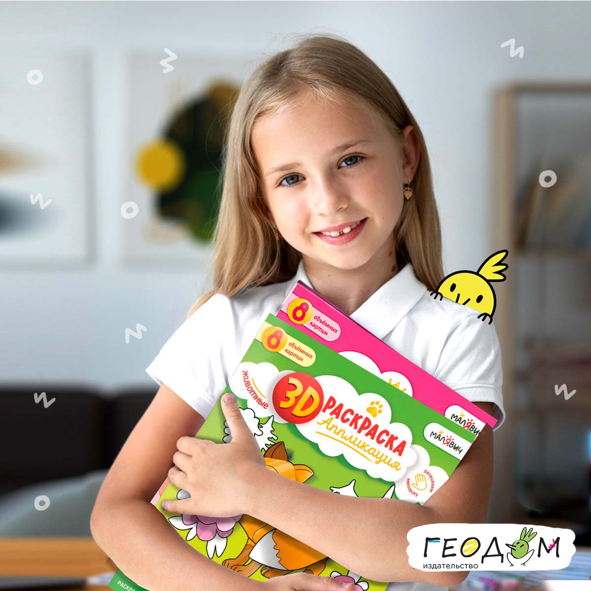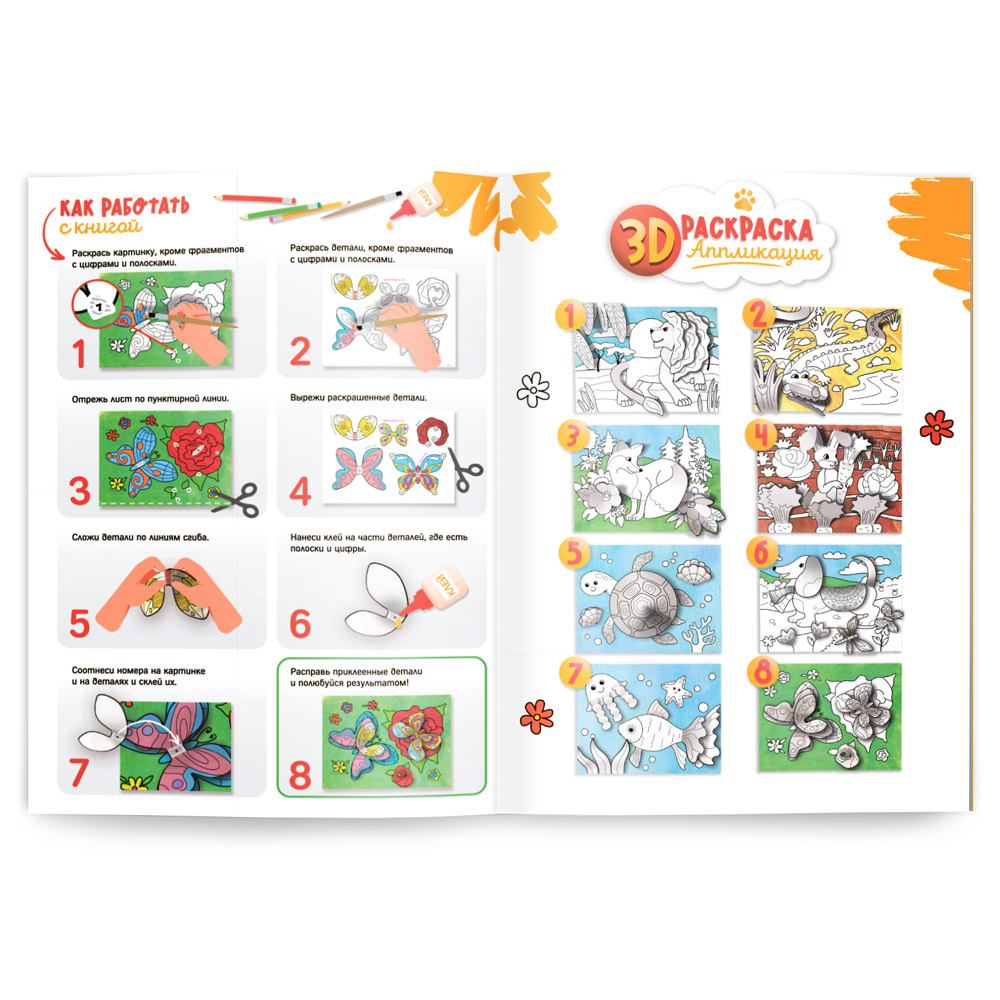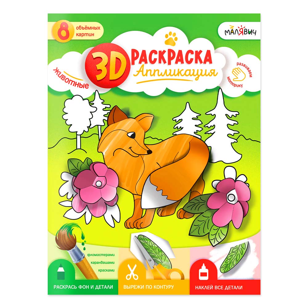 «3D-раскраска-аппликация. Животные» под брендом «МалЯвич» – это творческая тетрадь для создания объёмных картин! Внутри 8 картинок животных и детали к ним. Раскрасьте, вырежьте, приклейте – и полюбуйтесь результатом! Готовые картины можно подарить друзьям, украсить ими комнату или устроить выставку. Рекомендовано для детей дошкольного возраста.
