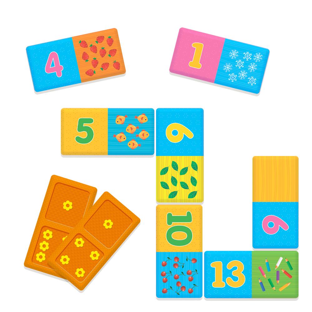 Первый вариант игры: в игре «участвуют» цифры и предметы, которые нужно сочетать. Каждая фишка состоит из цифры (от 0 до 13) и изображения не соответсвующих ей по количеству предметов. Цель игры — соотнести цифру с верным количеством предметов, соблюдая правила игры классического домино. Побеждает игрок, у которого раньше всех закончатся фишки.