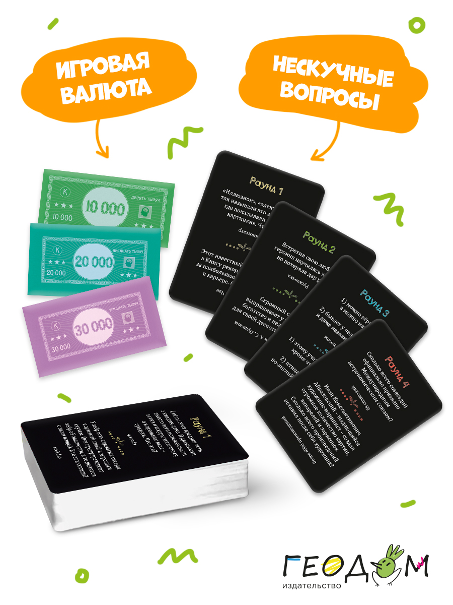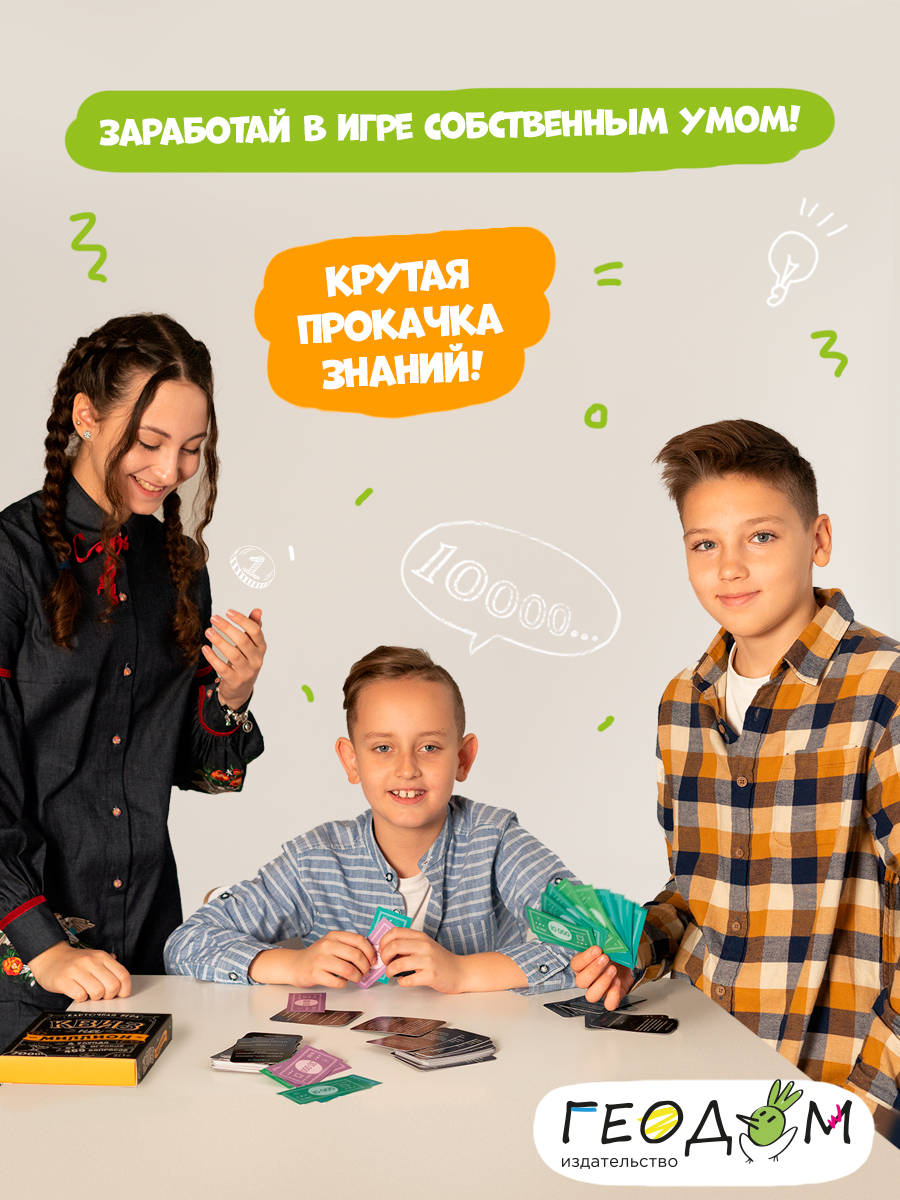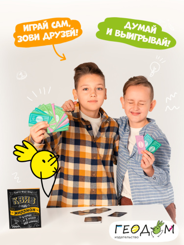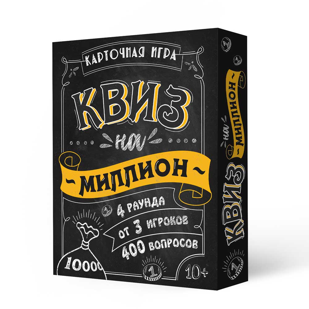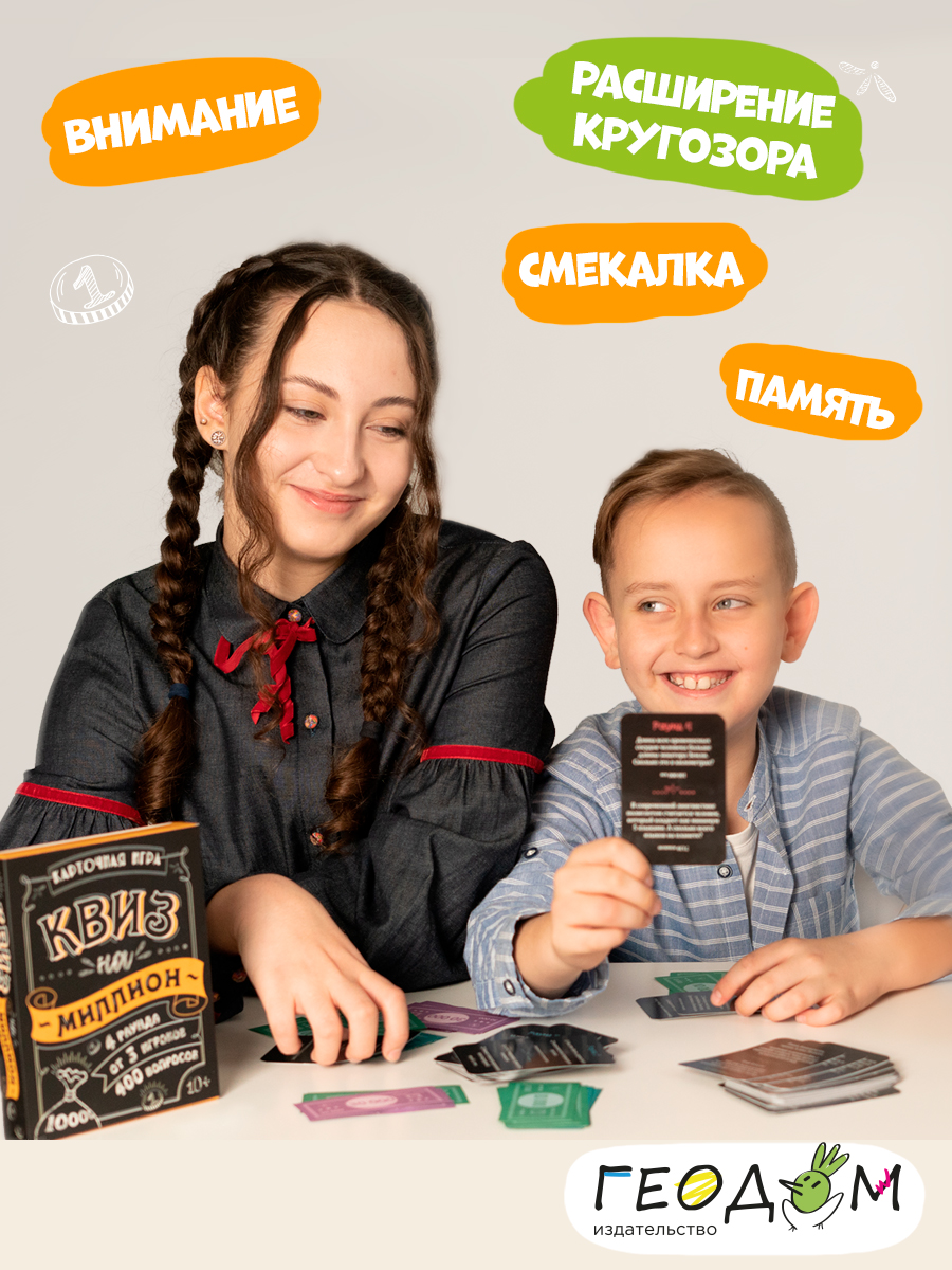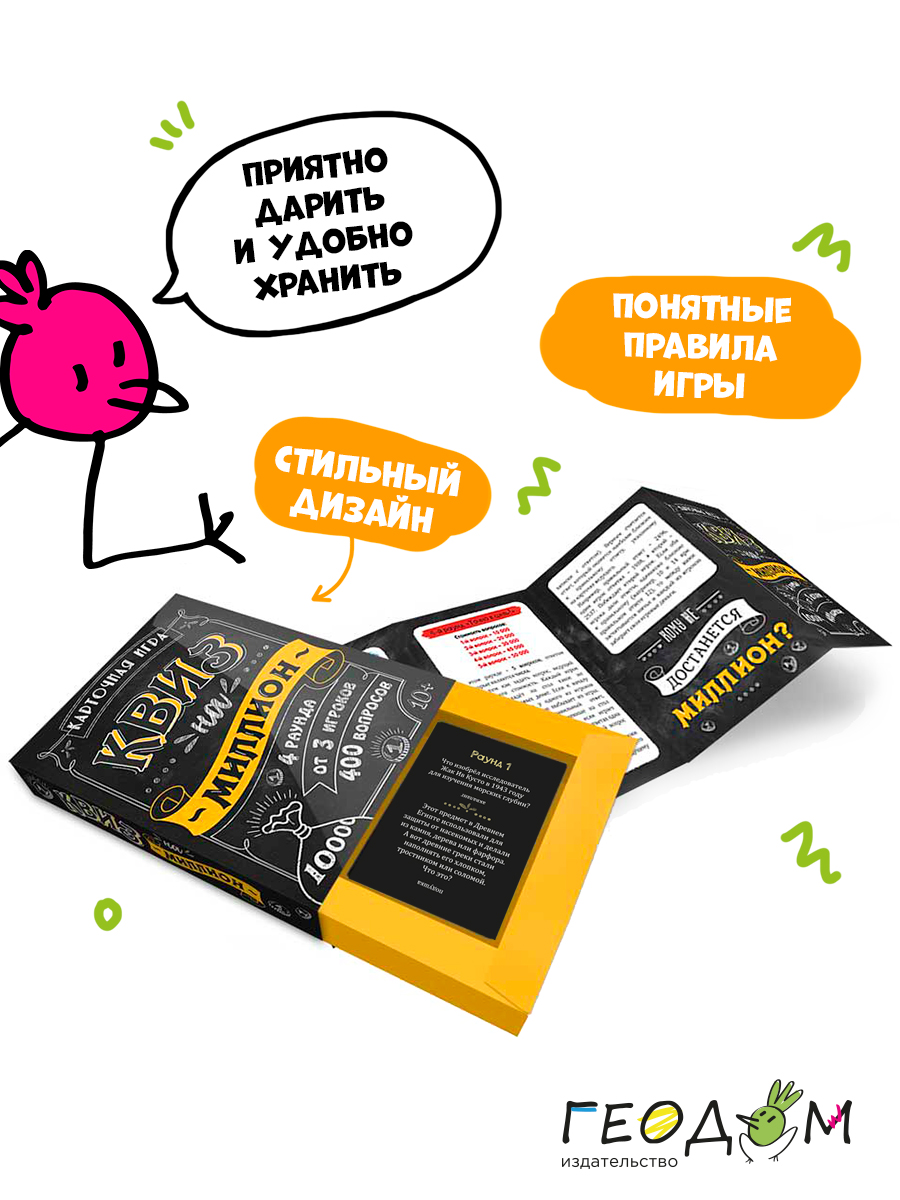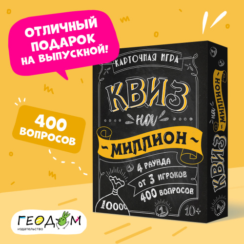 "Квиз" - интеллектуальная игра-викторина, с невероятной скоростью штурмующая полки магазинов и сердца многочисленных поклонников. Настольная игра "Квиз" от "Геодом" - это целых 400 крутых и неожиданных вопросов для детей и взрослых, стильная упаковка и неограниченное количество вариантов игры. Играйте вдвоем, играйте в кругу семьи или в дружной большой компании - процесс в любом случае окажется веселым и увлекательным! Игра не требует особенной подготовки либо фундаментальных знаний, здесь важна скорость реакции, сообразительность и смекалка, ведь ответ на вопрос очень часто лежит на поверхности. Комплектация: коробка из плотного картона, 100 глянцевых карточек форматом 6,5 см Х 9,5 см с вопросом и ответом. Рекомендуемый возраст игроков от 10 лет