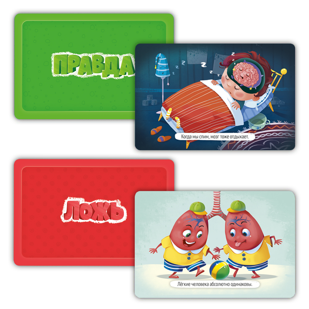 Эта карточная игра - находка для любознательных детей и их родителей! На карточках – 50 интересных фактов о теле человека и замечательные иллюстрации. Сможете ли вы разобраться, где правда, а где ложь? Играйте – будет интересно!