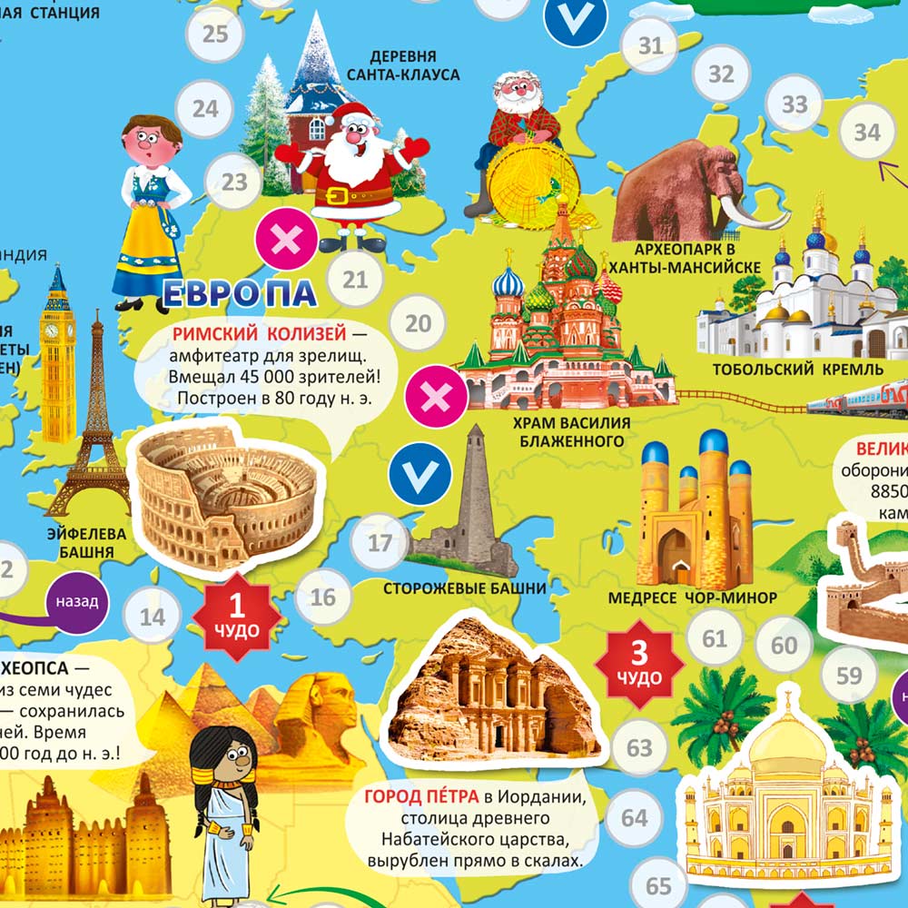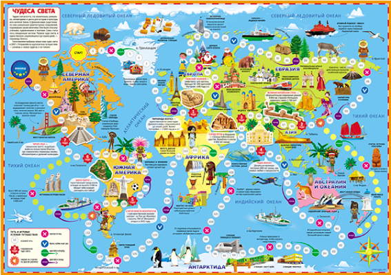 Это захватывающая игра-путешествие по всем материкам Земли. Во время путешествия откроются удивительные места в самых разных уголках нашей планеты. Необходимо пройти весь игровой путь и познакомиться с новыми чудесами света, которые были выбраны голосованием во многих странах мира. Побеждает в игре тот, кто первым достигнет финиша.