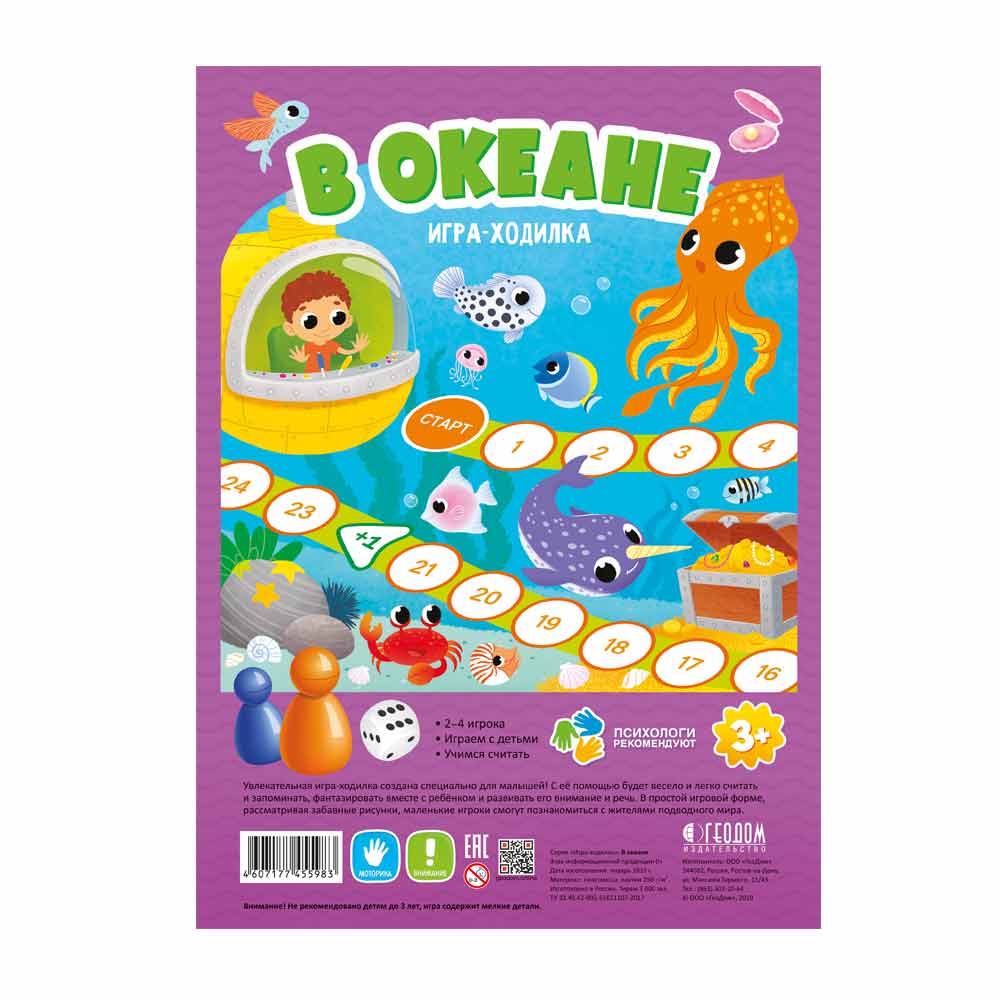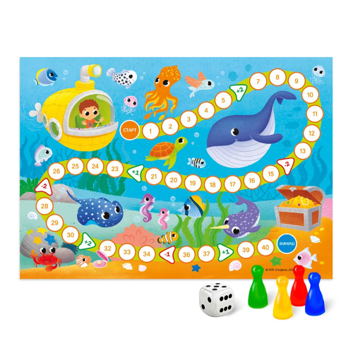Исследуйте морские глубины вместе с игрой-ходилкой для малышей “В океане”! Бросайте кубик, расставляйте фишки и знакомьтесь с жителями подводного мира - осьминогами, крабами, акулами, красочными рыбами, морскими коньками, китами и медузами. Кто первым доберется до финиша и соберет все подводные сокровища?