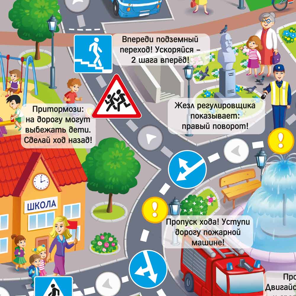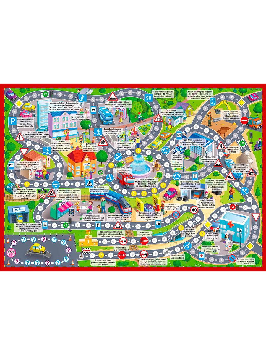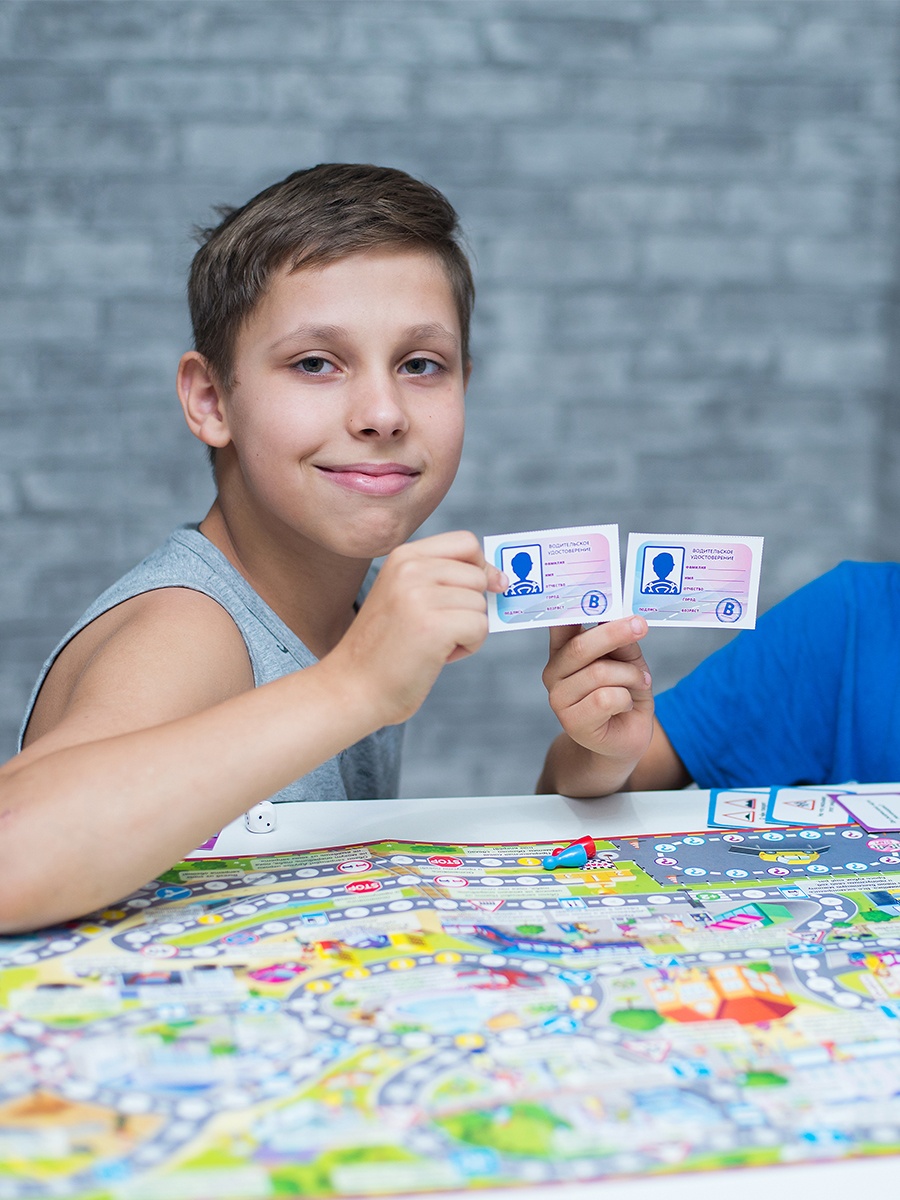 "Гонки по правилам" не просто настольная игра-ходилка — это настоящее приключение, в котором дети изучают правила дорожного движения. Для того, чтобы начать игру и выехать в город нужно сдать на права, а для этого игрокам предстоит ответить на несложные вопросы викторины. Только после этого участникам вручаются права и они могут выезжать в город.