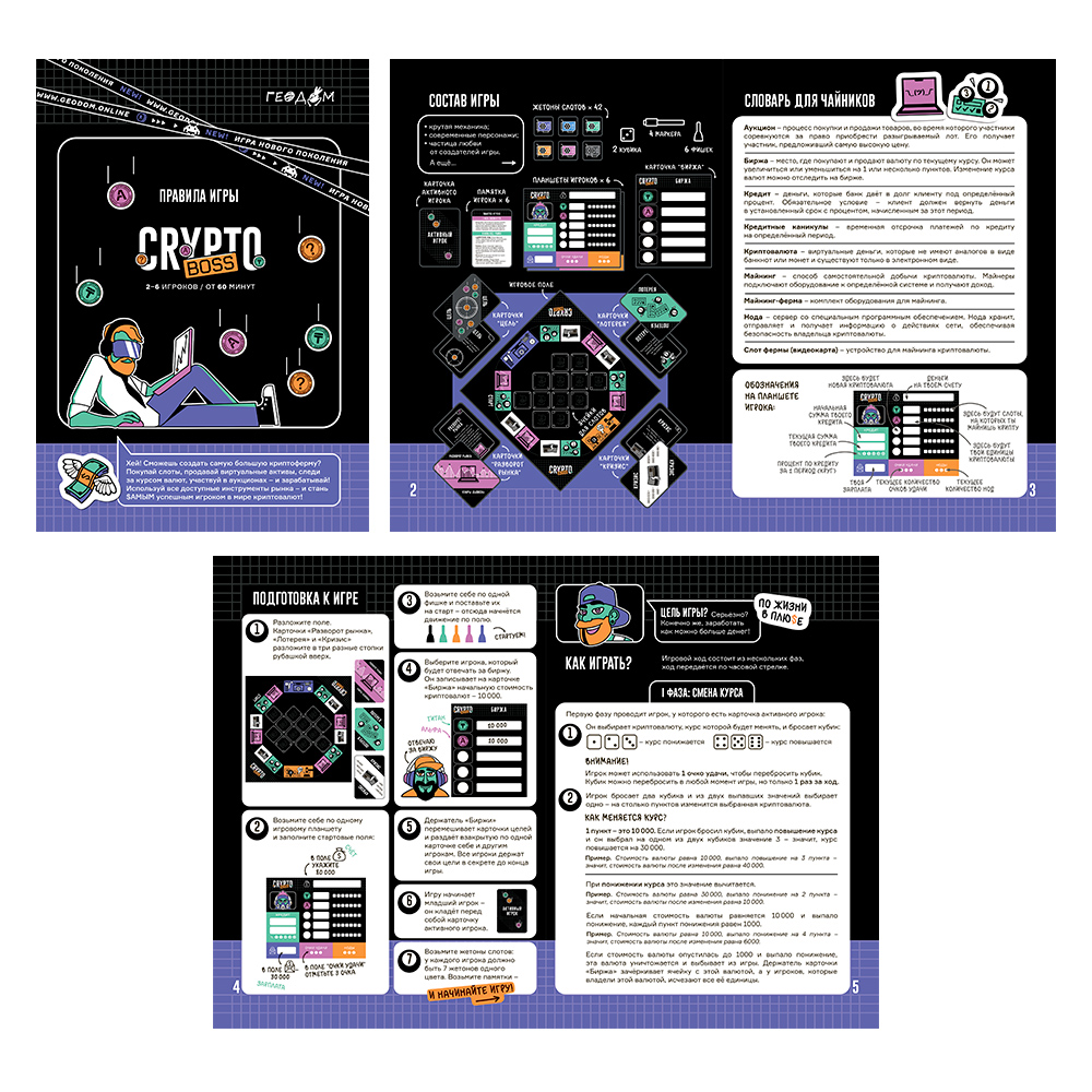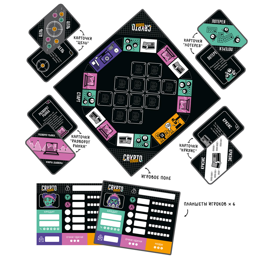 Самая актуальная новинка в категории игр «про деньги»! Модный дизайн, крутая механика, яркие персонажи – и море азарта! Вас ждёт торговля на бирже, майнинг криптовалюты, аукционы – и многое другое! Каждая клетка на поле может оказаться решающей – бросай кубик и используй максимум возможностей, чтобы стать лучшим игроком в криптомире. Количество игроков: 2–6. Рекомендованный возраст: 14+
