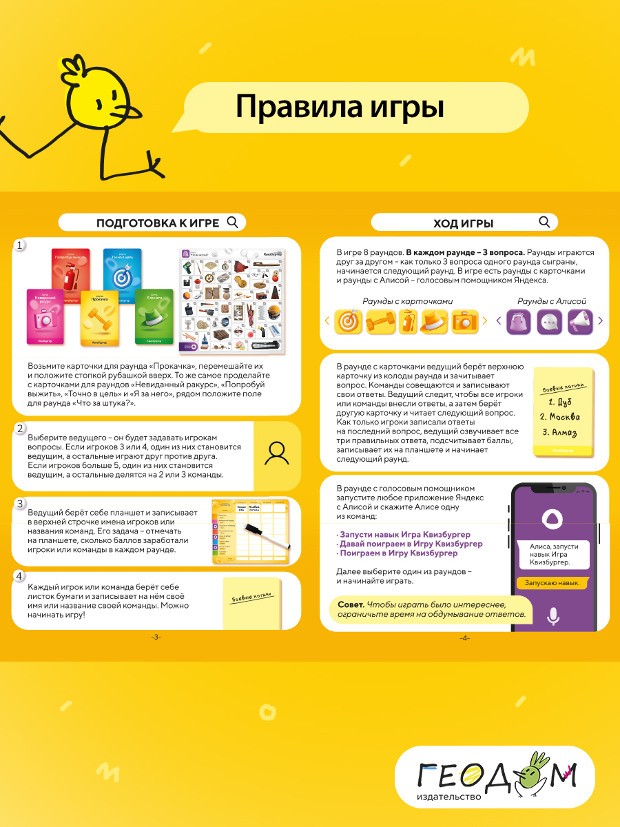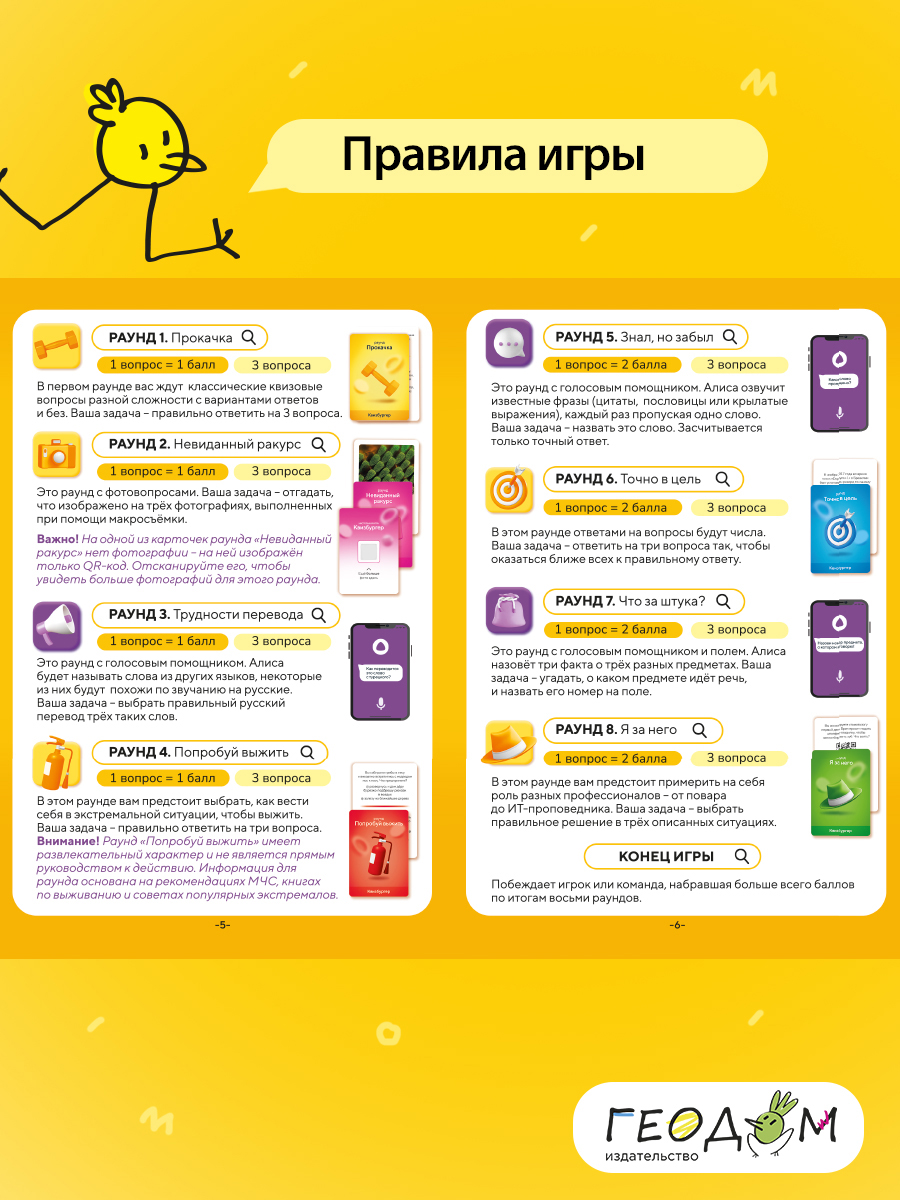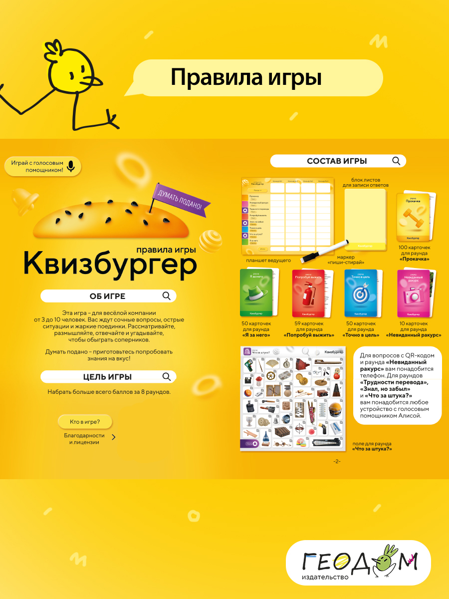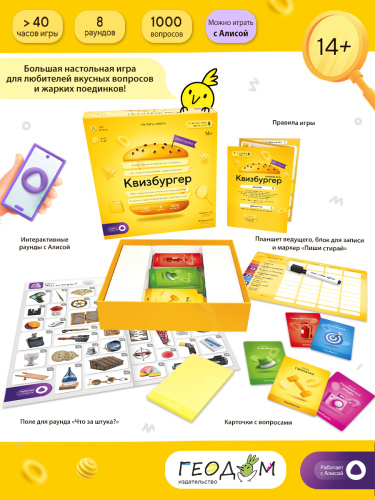 Большая настольная игра для любителей вкусных вопросов и жарких поединков! Вас ждёт 8 раундов, включая раунды с голосовым помощником Яндекса – Алисой. Приготовьтесь вспомнить всё, что знаете, и открыть для себя много нового и интересного. Вам понадобятся: эрудиция, логика, интуиция и, конечно, нестандартное мышление! Думать подано – попробуйте знания на вкус! Рекомендованный возраст: 14+.