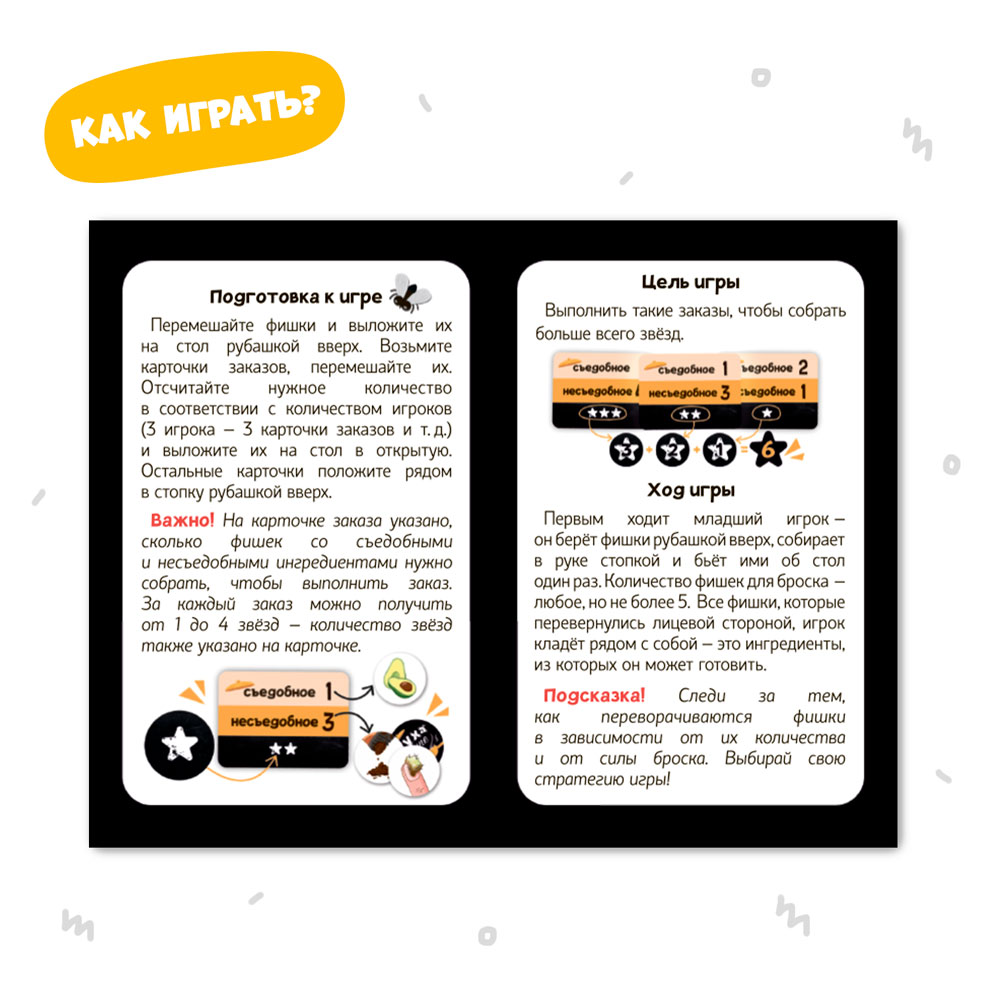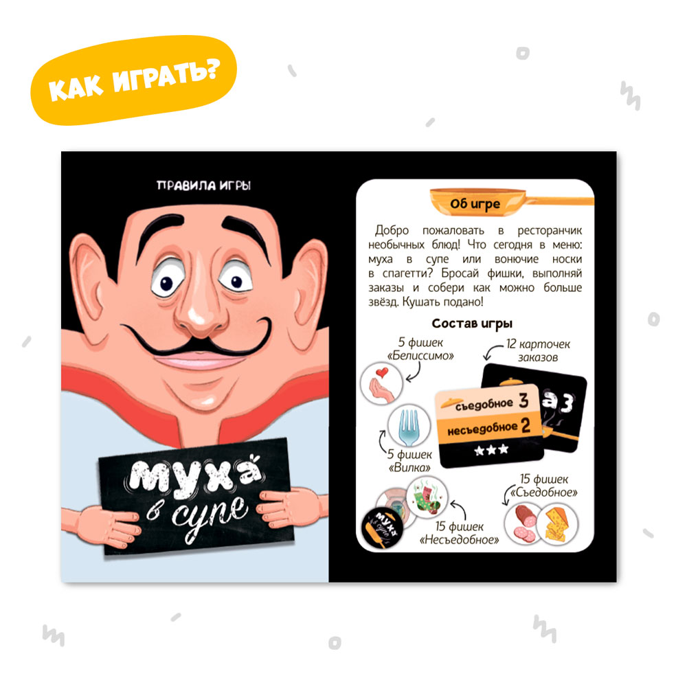 Стань поваром в странном ресторанчике, где всё отвратительное – вкусно! Бросай фишки с ингредиентами об стол, выполняй заказы – и собери как можно больше звёзд, чтобы победить. Открой коробку-трансформер – и накорми повара! В игре 40 фишек и 12 карточек. Игра развивает моторику, внимание и воображение. Рекомендованный возраст: 5+.