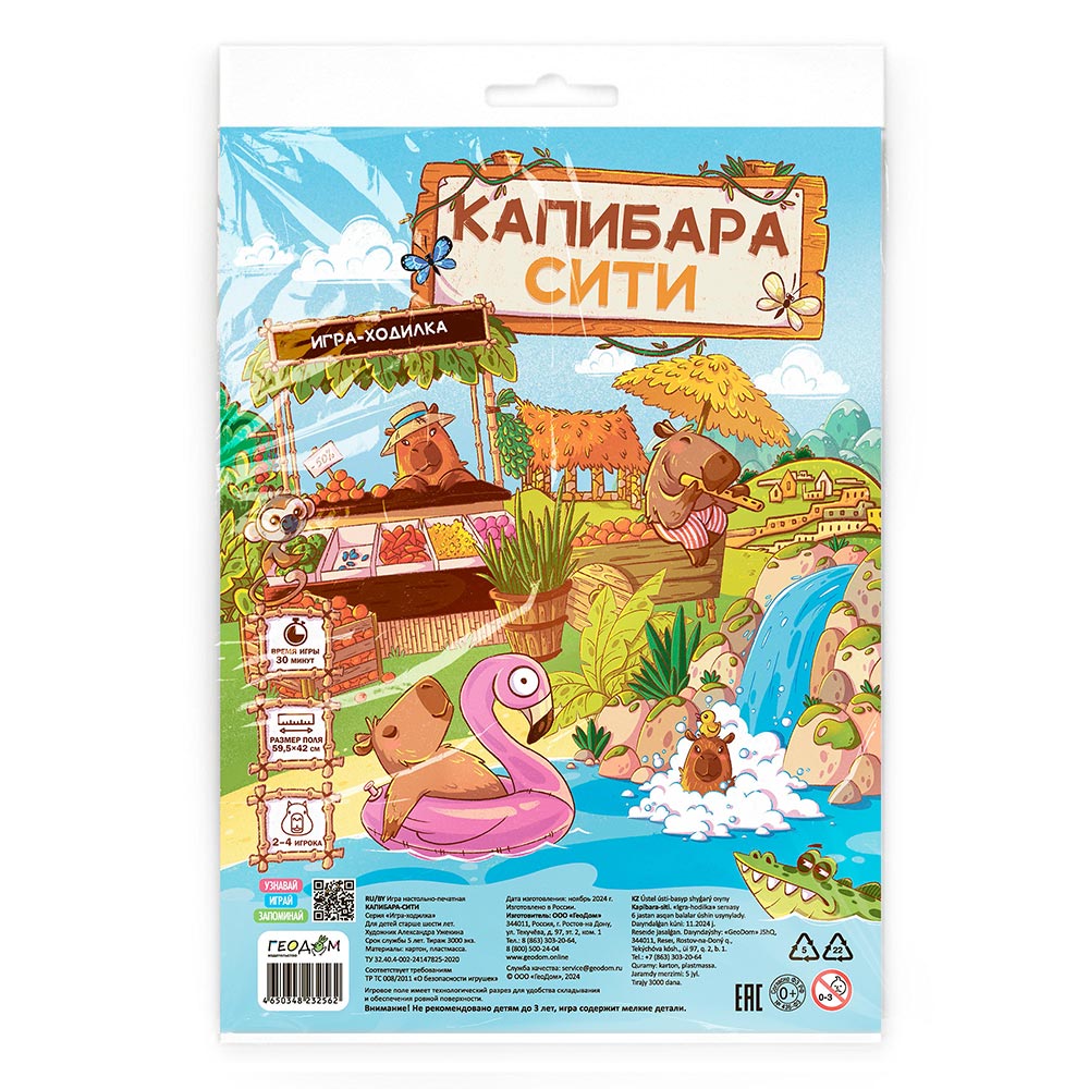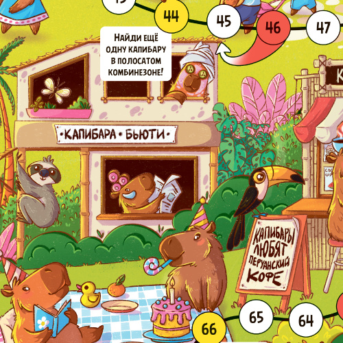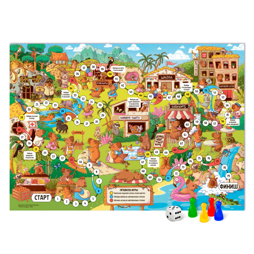 «Капибара-сити» – это увлекательная игра-ходилка для детей с забавными и милыми зверятами. Игроки перемещаются по полю, преодолевая различные препятствия. Задания «найди и покажи» на сравнение и поиск предметов и героев делают классическую игру-ходилку ещё интереснее. Поле с яркими и забавными рисунками из жизни Капибара-сити притягивает взгляд, а милые и комичные капибары точно понравятся детворе! Проведи время в солнечном городе капибар со смешными зверятами! Игра для 2–4 игроков. Рекомендованный возраст: 6+