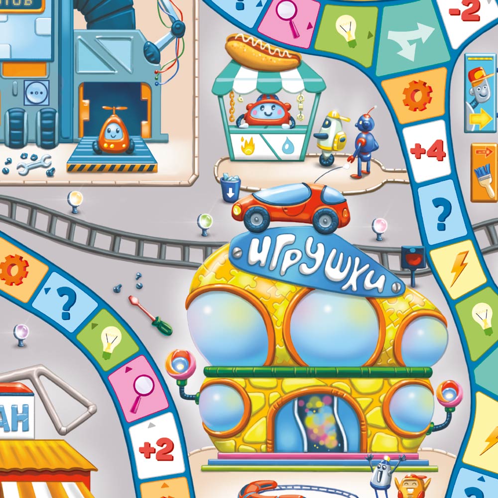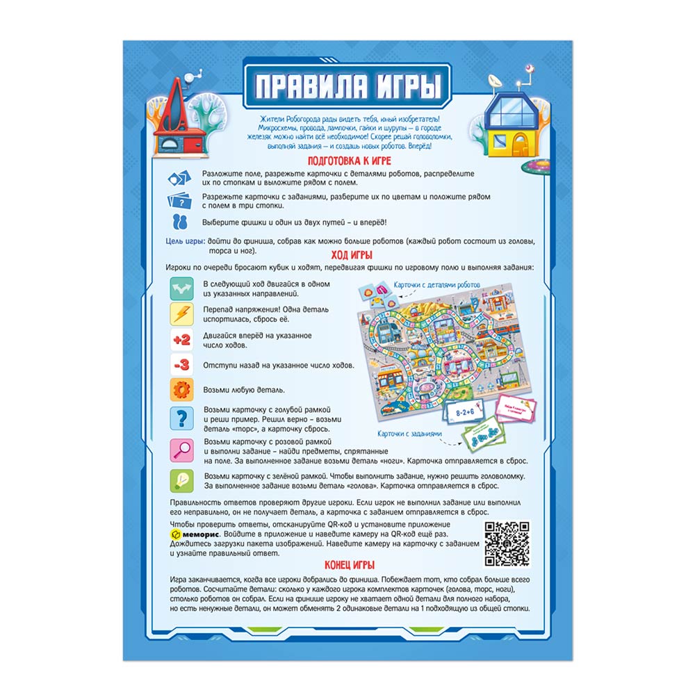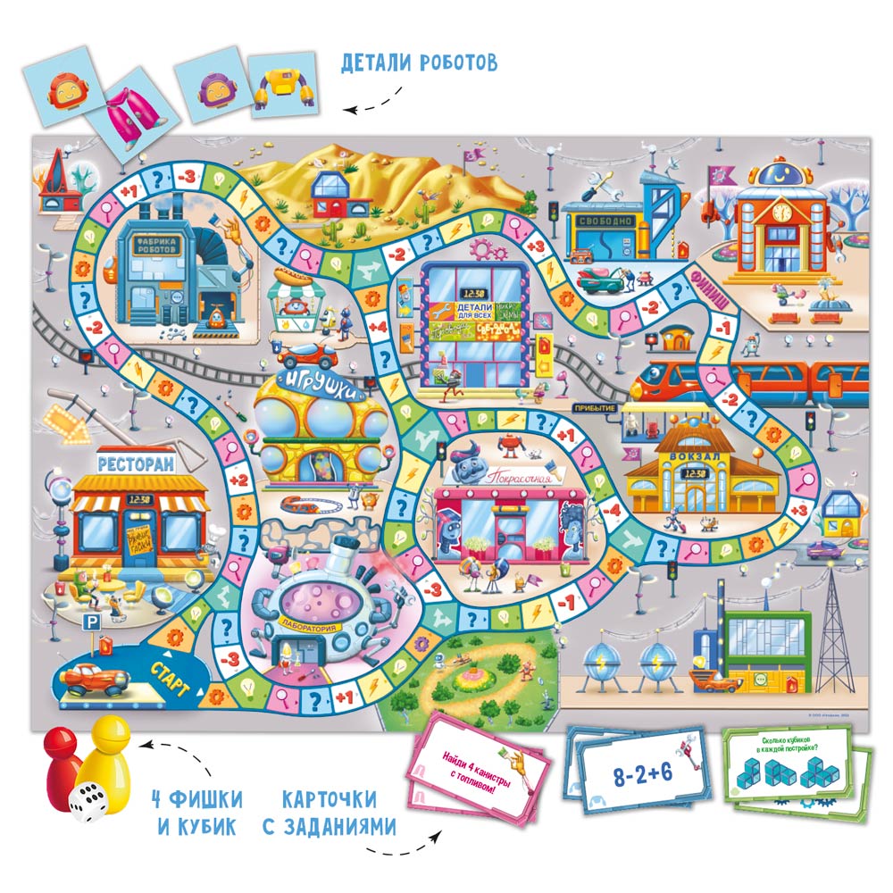 Отправляйтесь в удивительный город роботов! Игровое поле, карточки, кубик и фишки – внутри. Игра тренирует внимание, развивает интеллект и логическое мышление. Микросхемы, провода, лампочки, гайки и шурупы – в Робогороде есть всё! Отгадывайте головоломки, решайте примеры и находите на поле спрятанные предметы. Двигайтесь по полю, выполняйте задания, собирайте детали – и создавайте новых роботов! Количество игроков: 2–4. Рекомендованный возраст: 6+.