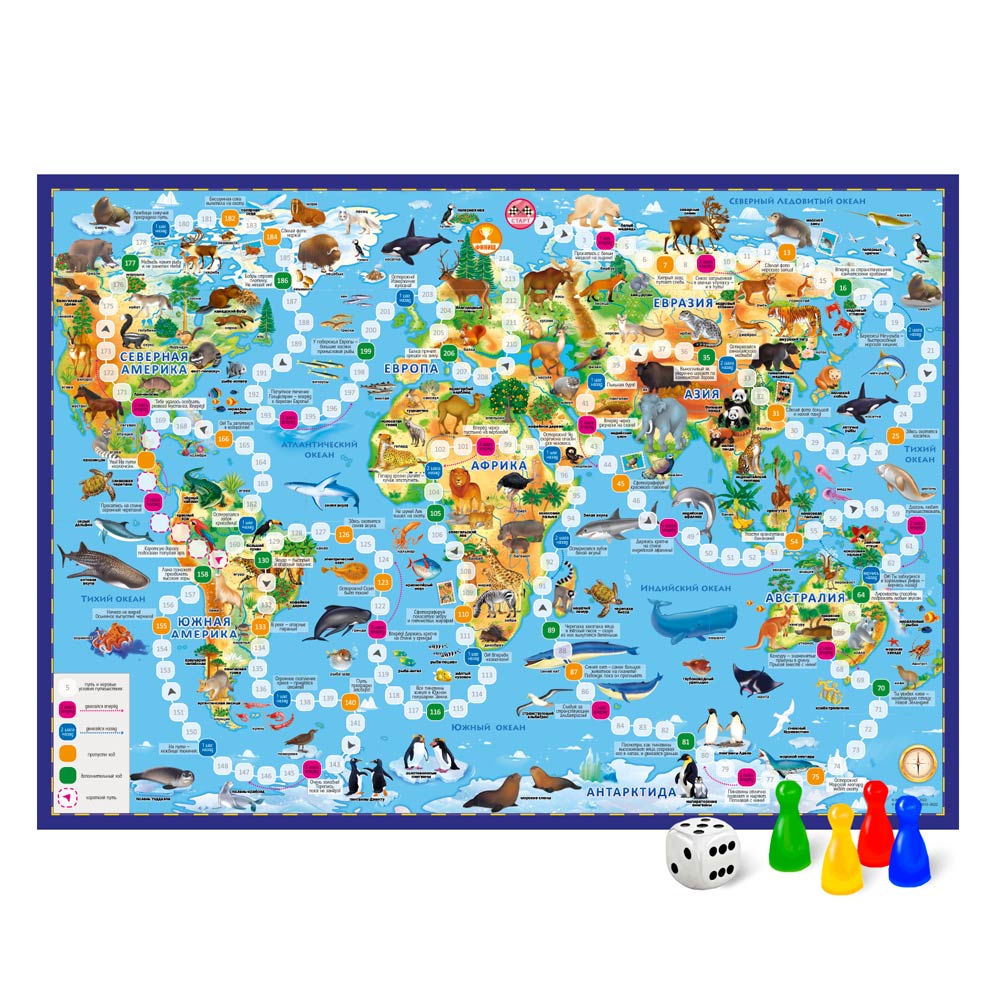 Для захватывающего путешествия по континентам и океанам нашей планеты созданы интересные и даже опасные ситуации, которые могли бы произойти с отважными путешественниками в пути. Правила игры просты. Когда дети их освоят, можно отправляться в путешествие. Побеждает игрок, который первым придёт к финишу. Игра продолжается, пока её не закончит предпоследний игрок.