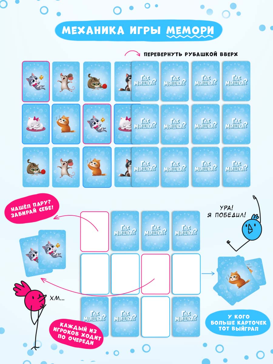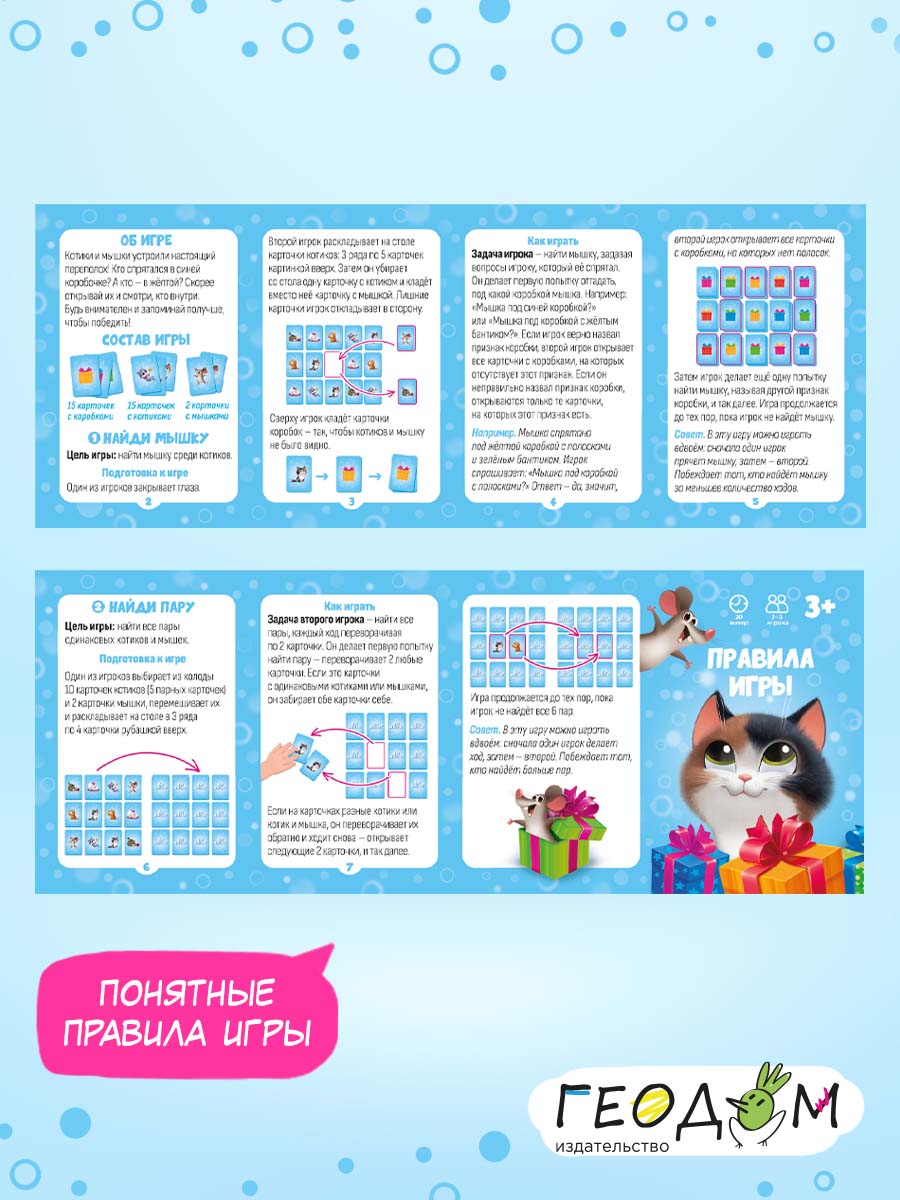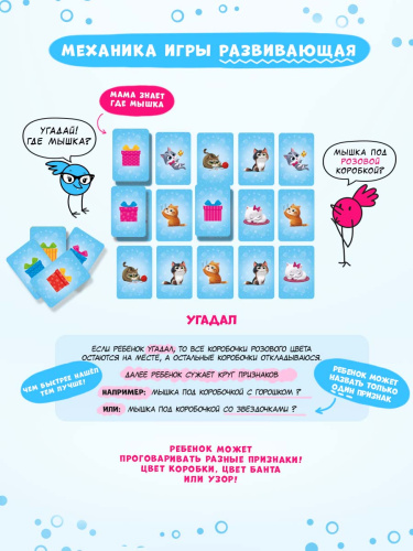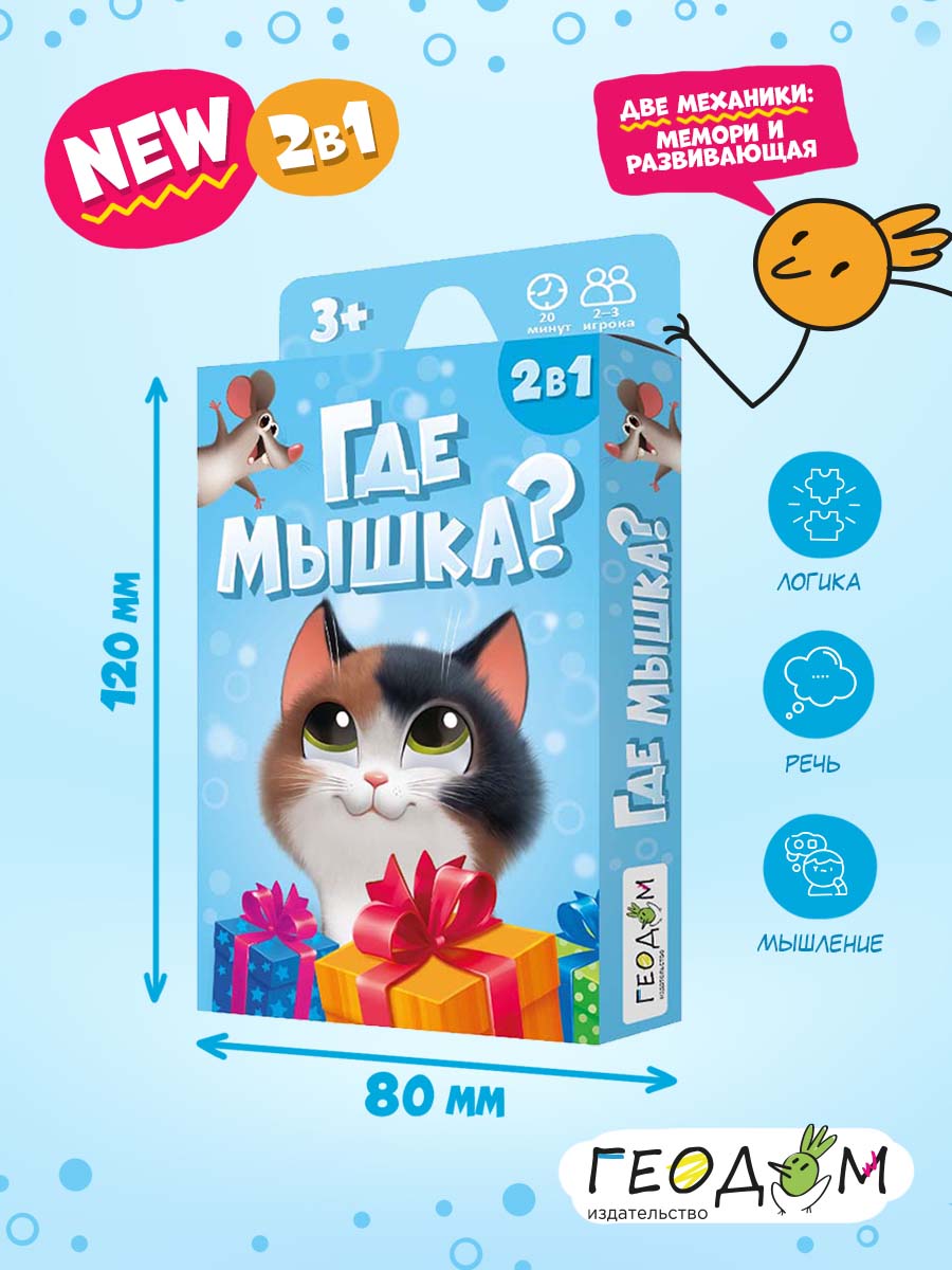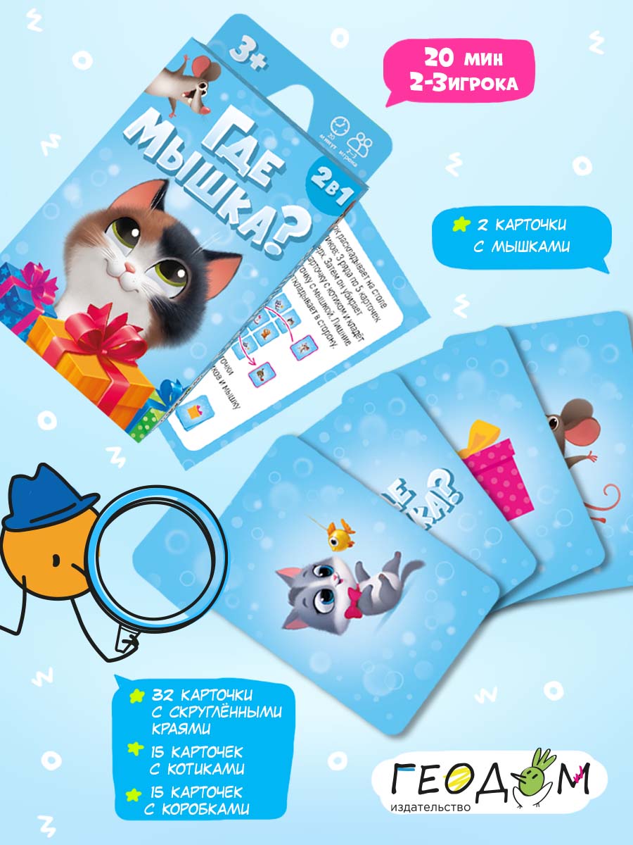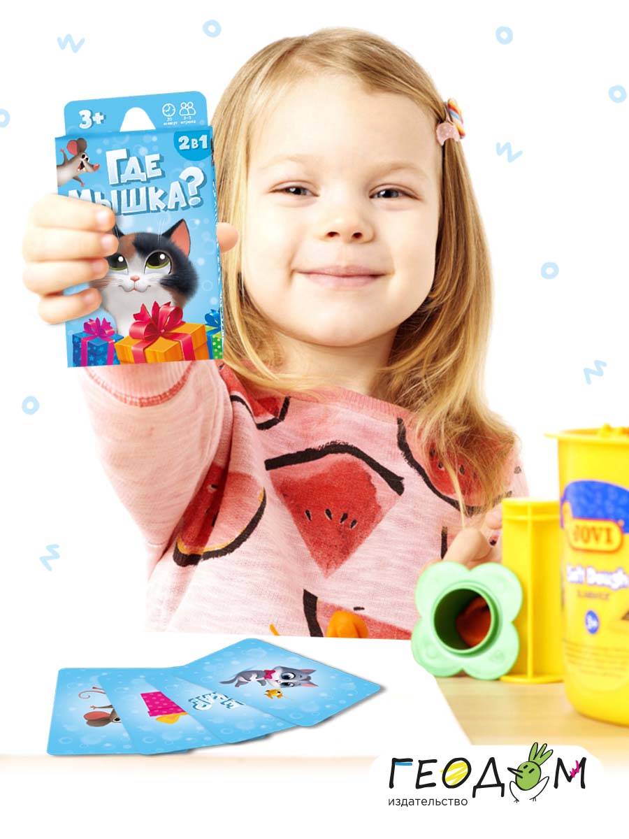«Где мышка?» – карточная игра для самых маленьких. В одной коробке – две игры на развитие памяти и внимания, логики и речевых навыков. Задавайте вопросы правильно, открывайте по очереди цветные коробочки – и смотрите, кто притаился внутри. Попробуйте отыскать мышку среди котиков и найти все пары. Рекомендованный возраст: 3+