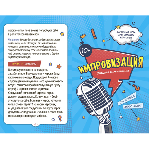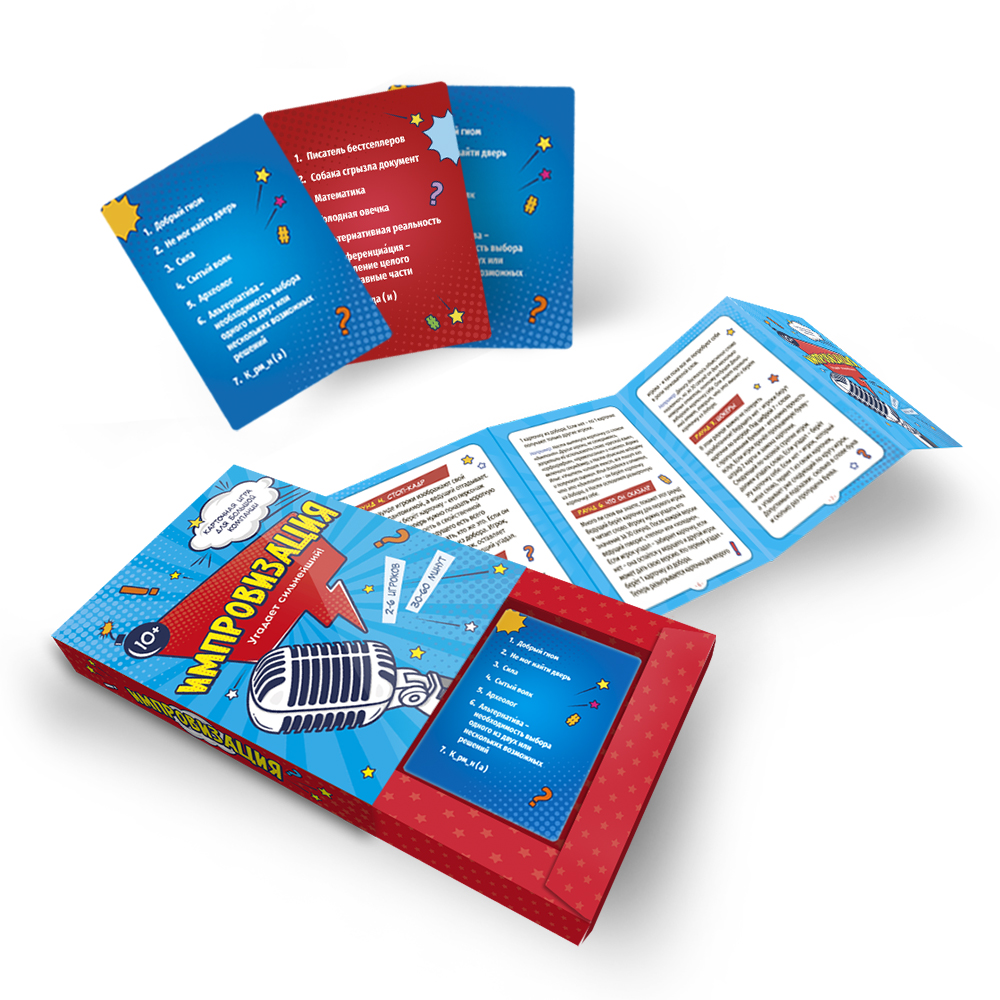Карточная игра «Импровизация» — это совершенно новый формат карточной игры с захватывающим сюжетом! Механика игры построена на заданиях, разделенных на 7 раундов! Каждый игрок откроет в себе актёрский талант и станет мастером импровизации! «Объяснить слова без слов», «угадать смысл неизвестных понятий», «читать по губам» - только часть увлекательных заданий в борьбе за звание Великого импровизатора! Игра предназначена для игры как вдвоем, так и в компании; для детей и их родителей!