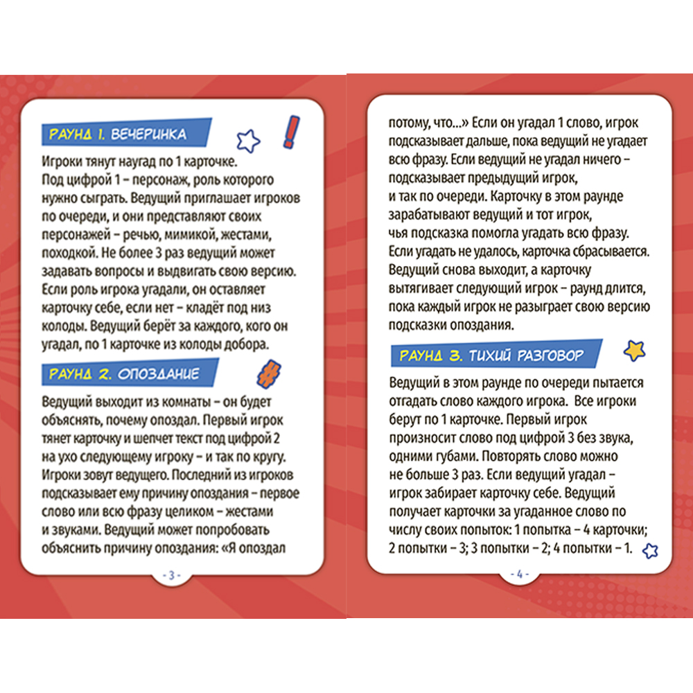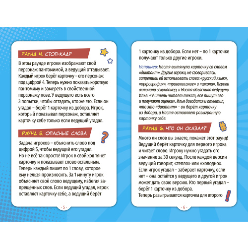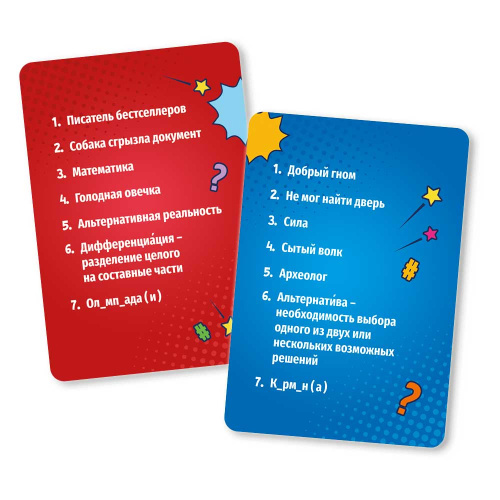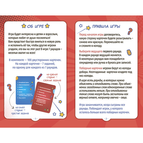 В комплект игры входит: 100 карточек 6,5х9,5 см, вкладыш с правилами игры.