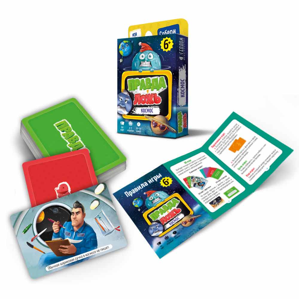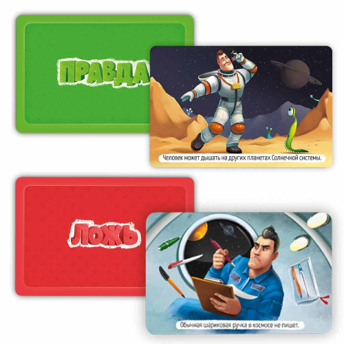Эта карточная игра – находка для любознательных детей и их родителей! На карточках – 50 интересных фактов о тайнах космоса и замечательные смешные иллюстрации. Сможете ли вы разобраться, где правда, а где ложь? Играйте – будет интересно!