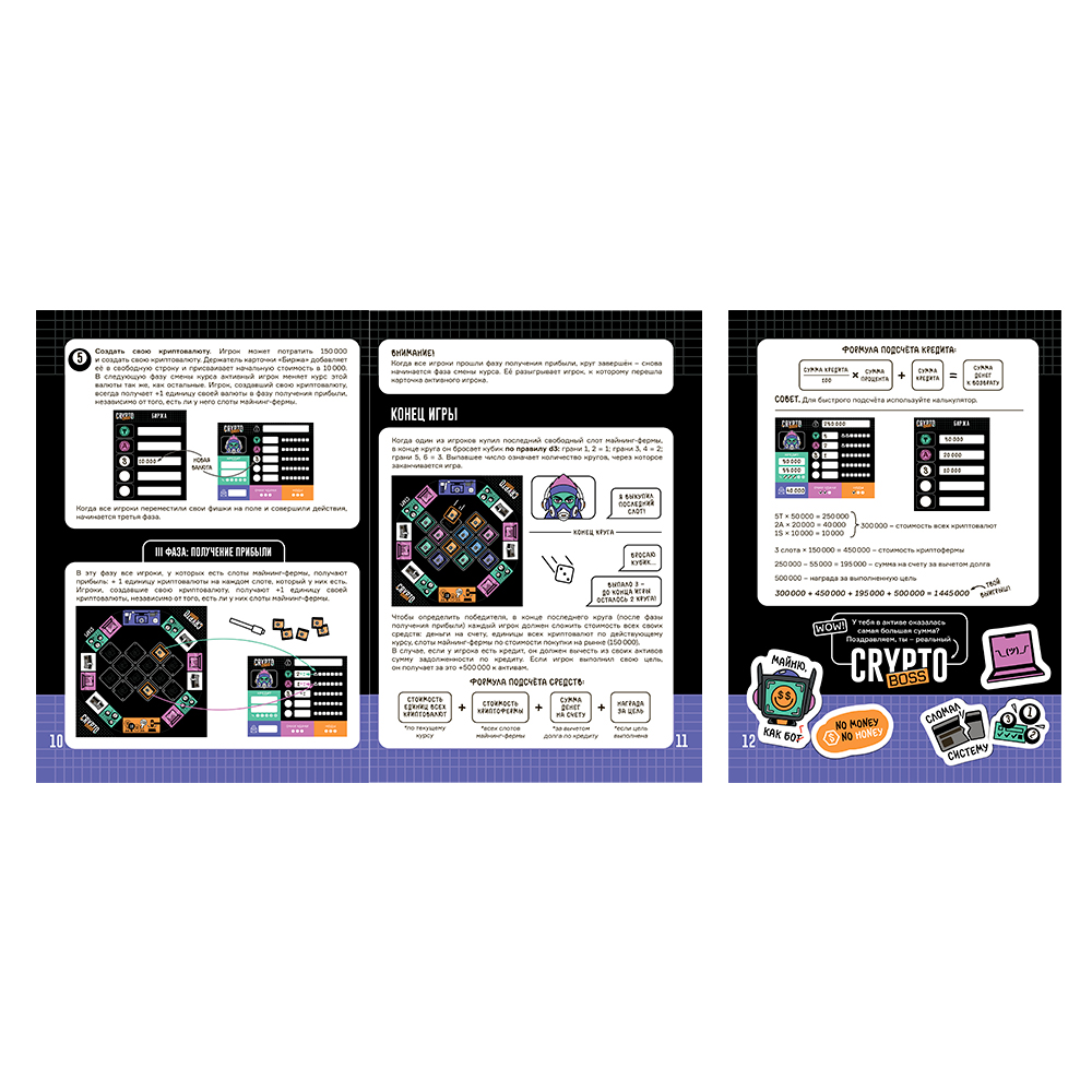 Самая актуальная новинка в категории игр «про деньги»! Модный дизайн, крутая механика, яркие персонажи – и море азарта! Вас ждёт торговля на бирже, майнинг криптовалюты, аукционы – и многое другое! Каждая клетка на поле может оказаться решающей – бросай кубик и используй максимум возможностей, чтобы стать лучшим игроком в криптомире. Количество игроков: 2–6. Рекомендованный возраст: 14+