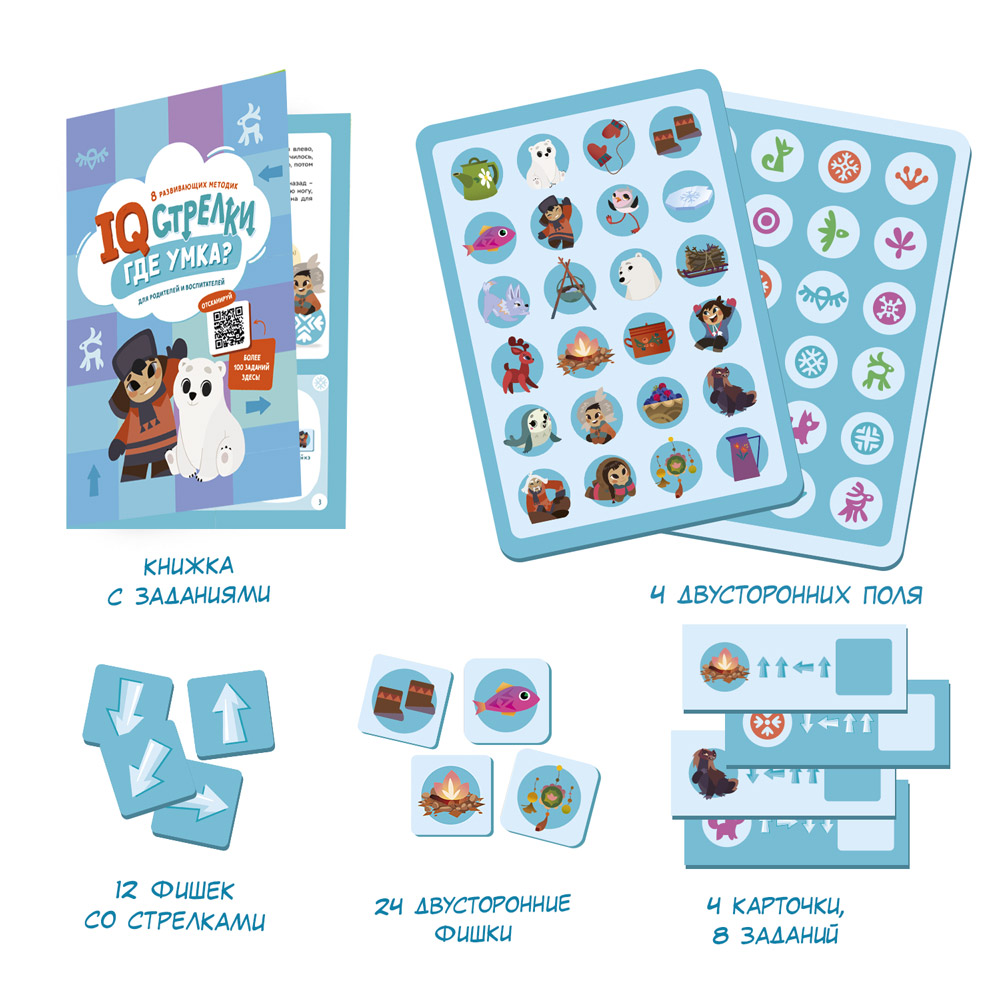 «IQ-стрелки. Где Умка?» – обучающая игра, которая поможет научить ребёнка ориентироваться в пространстве быстро и легко! Учиться, развивать логику и тренировать память – интереснее вместе с Умкой и его друзьями. Внутри 8 развивающих методик и более 100 заданий, которые помогут освоить азы логики и математики. Готовые варианты заданий и игр легко появятся в вашем смартфоне – воспользуйтесь QR-кодом! Состав игры: 4 двусторонних поля с героями любимого мультфильма, 24 фишки с картинками, 12 фишек со стрелками, 4 карточки с заданиями. Рекомендованный возраст: 3–5 лет.