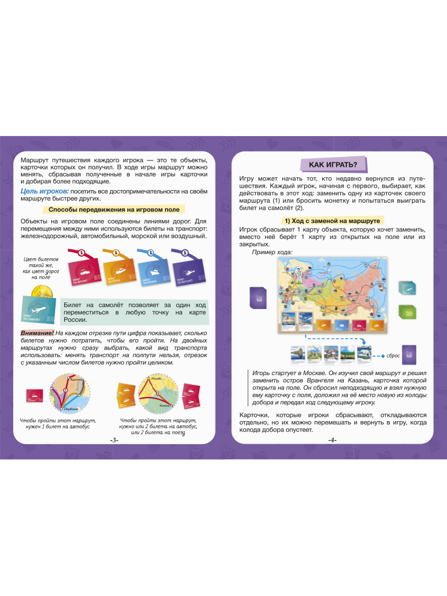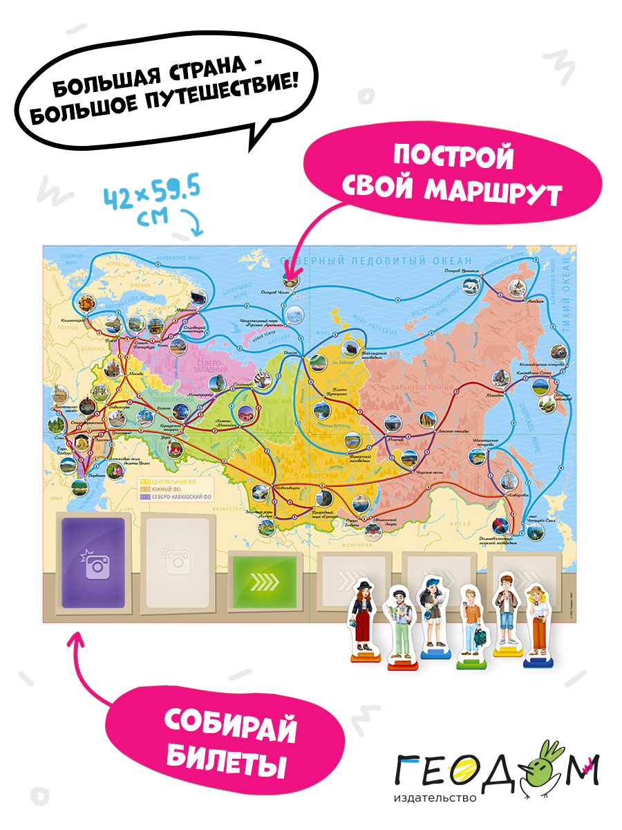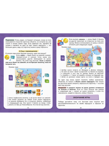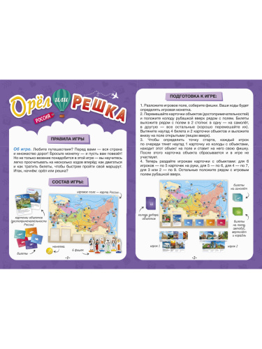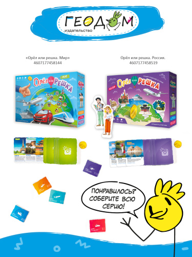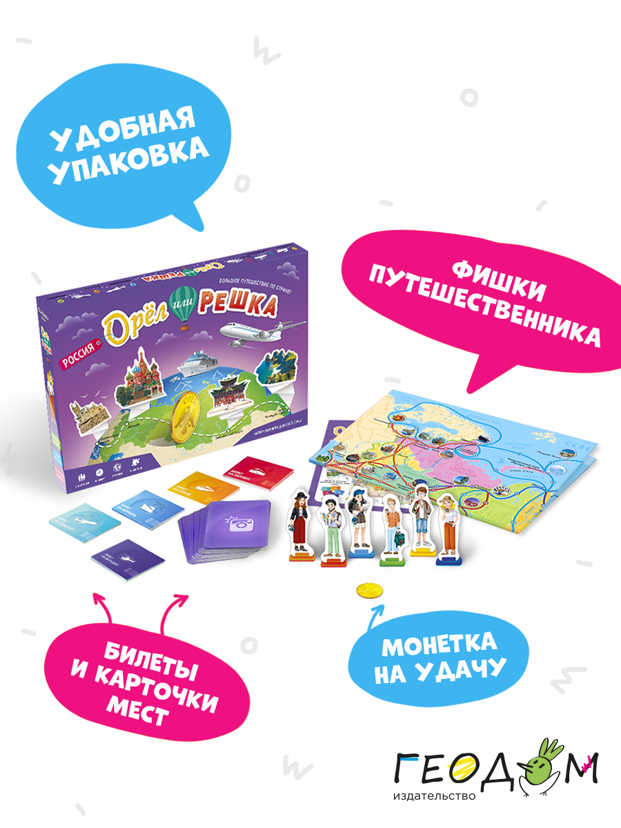 Большая страна – большое путешествие! Добро пожаловать в настольную игру «Орёл или решка. Россия. Серия Чудеса планеты». Хочешь увидеть самые интересные места России? Тебя ждут билеты на поезда, самолеты, автобусы и даже вертолеты, восхитительная природа и интересные достопримечательности страны. Чтобы добраться до цели, нужна не только удача, но и правильная стратегия: продумай оптимальный маршрут, не упусти лучшие ходы, экономь билеты, заглядывай по пути в ближайшие города и лови потрясающие снимки. Кидай монетку и не пропусти шанс выиграть! Путешествуй – и побеждай!