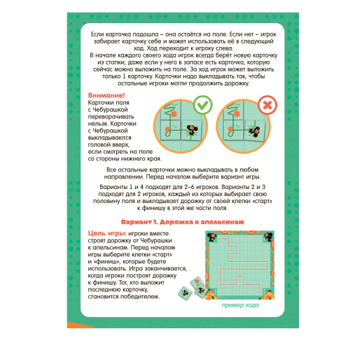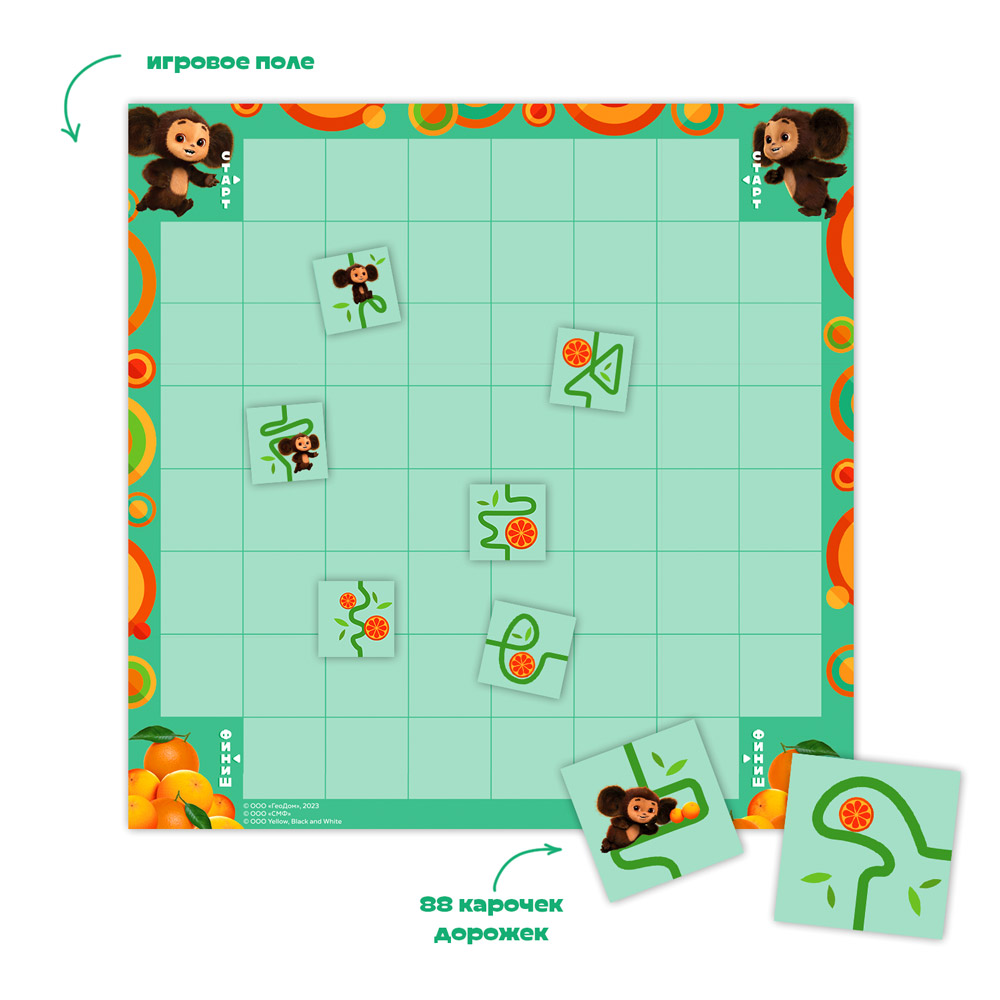Куда идём мы с... Чебурашкой? Куда он, туда и я! На весёлой прогулке с любимым героем тебе предстоит прокладывать дорожки, поворачивать фишки и обгонять соперников. Игра развивает логику, пространственное мышление, тренирует зрительную память и внимание. Количество игроков - 2-6. Рекомендованный возраст - 5+