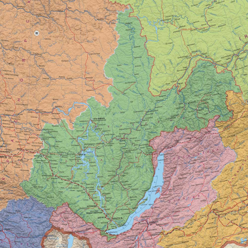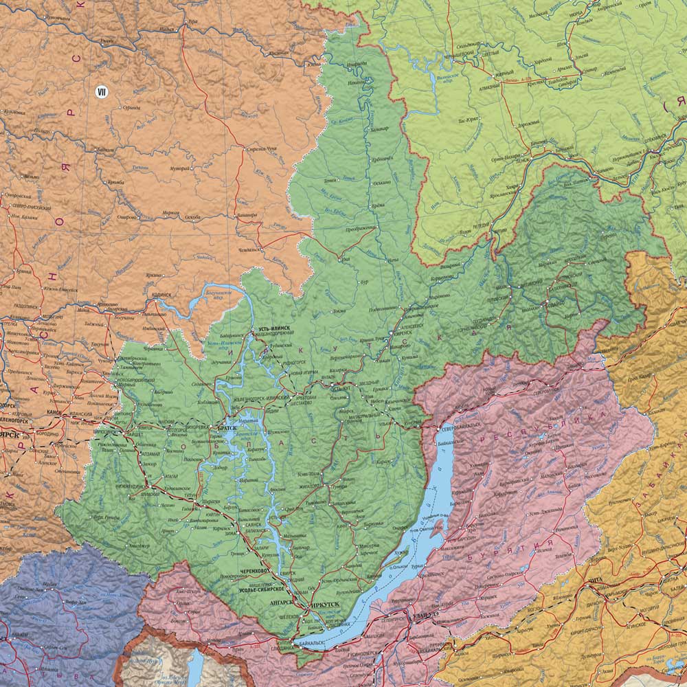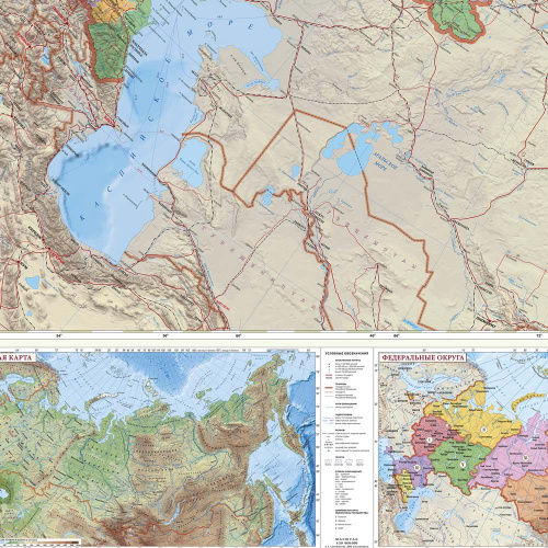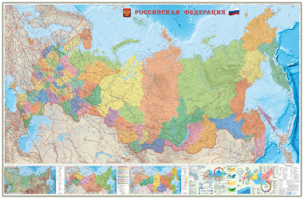 На карте отражено политико-административное устройство государства: даны границы федеральных округов, цветом выделены территории субъектов, населённые пункты отображены по типу поселения, числу жителей и административному значению. Также на карте показаны основные автомобильные и железные дороги, паромные переправы, морские пути, морские и речные порты.