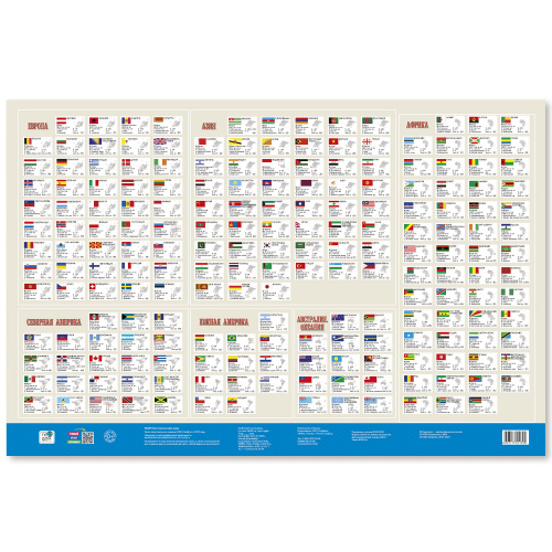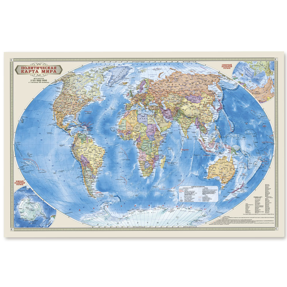 Карта политического мира подробно отражает современное политико-административное устройство мира и границы государств. Территории государств выделены цветом. Населённые пункты отображены по числу жителей и административному значению, показаны основные наземные пути сообщения и судоходные каналы. Особенность данной карты в том, что на ней, помимо геополитической информации, размещена символика государств мира. Государственные флаги стран мира сгруппированы по каждому континенту.
