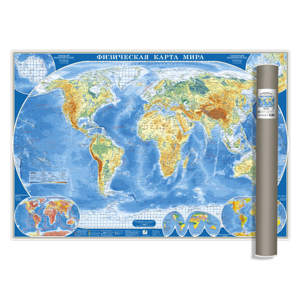 Карта 157х107 см. Мир Физический. ЛАМ. Настенная в тубусе. М1:21,5 млн. ГЕОДОМ