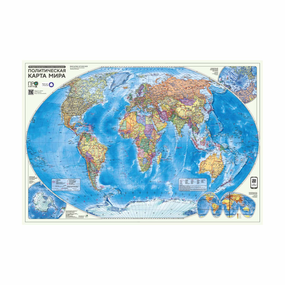 Пора изучать географию на 5+! «ПРОкарта» – новая линейка интерактивных карт с голосовым помощником и отличный тренажер для изучения географии. Найди на карте QR-код и смотри видео "Простой способ понять карту". Запусти навык "ПРОкарта. Мир политический" и используй один из 3 режимов или сразу все! Голосовой помощник поможет узнать новое, будет задавать вопросы, давать подсказки и попросит найти объекты на карте! С навыком легко изучить и запомнить политическую карту мира. На политической карте мира подробно отражено современное политико-административное устройство мира, даны границы государств. Территории государств выделены цветом. Населённые пункты отображены по числу жителей и административному значению, показаны основные наземные пути сообщения и судоходные каналы. У карты удобный размер 101х69 см, её удобно использовать в офисе и дома. От повреждений и выцветания карта защищена ламинацией.