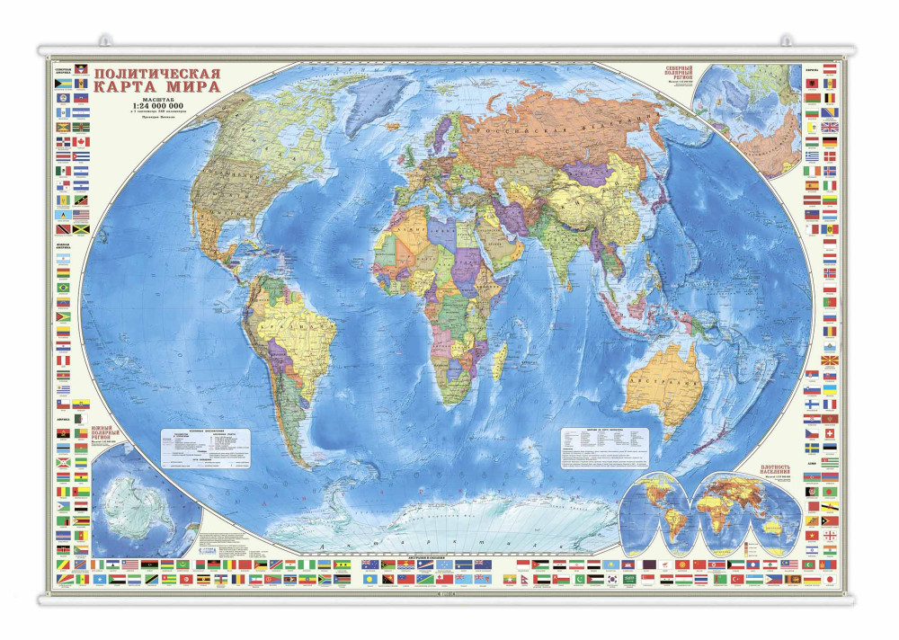 Карта 124х80 см. Мир Политический с флагами. Настенная на рейках. М1:24 млн._старые границы