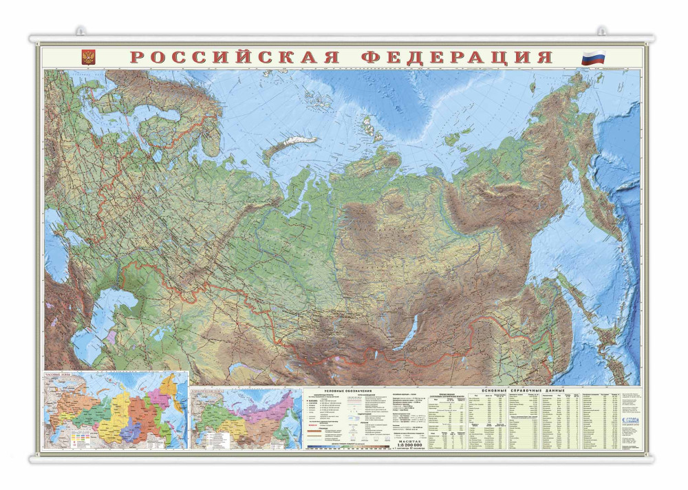 Карта 101х69 см. Россия Физическая. ЛАМ. Настенная на рейках. М1:8,2 млн._старые границы