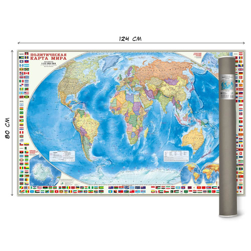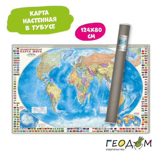 Карта 124х80 см. Мир Политический с флагами. Настенная в тубусе. М1:24 млн. ГЕОДОМ