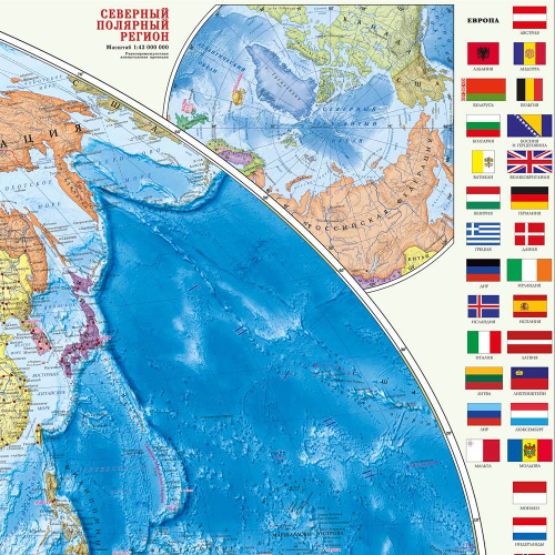 Карта политического мира подробно отражает современное политико-административное устройство мира и границы государств. Территории государств выделены цветом. Населённые пункты отображены по числу жителей и административному значению, показаны основные наземные пути сообщения и судоходные каналы. Особенность данной карты в том, что на ней, помимо геополитической информации, размещена символика государств мира. Государственные флаги стран мира сгруппированы по каждому континенту.