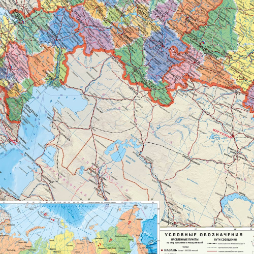 На карте РФ отражено политическое деление государства: субъекты федерации выделены цветом. Населенные пункты показаны по численности, даны основные пути сообщения внутригосударственного значения. Содержит современную карту часовых поясов России и статистические данные по федеральным округам (площади, численность населения).