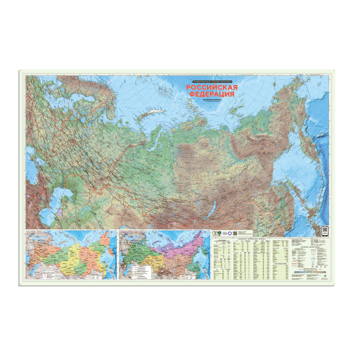 Кроме этого на карте вы найдете основные справочные сведения о Российской Федерации, информацию о крупнейших геологических объектах, о часовых и климатических зонах России.