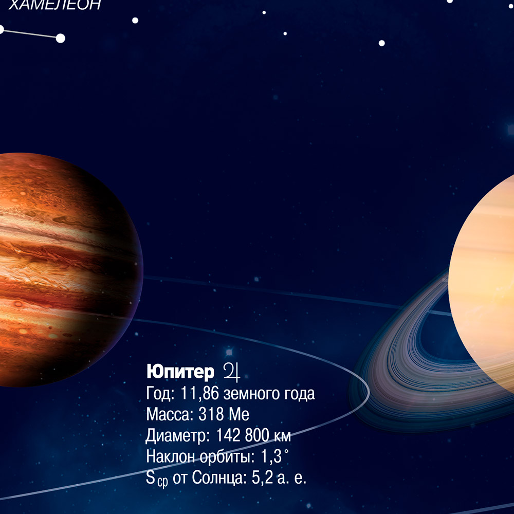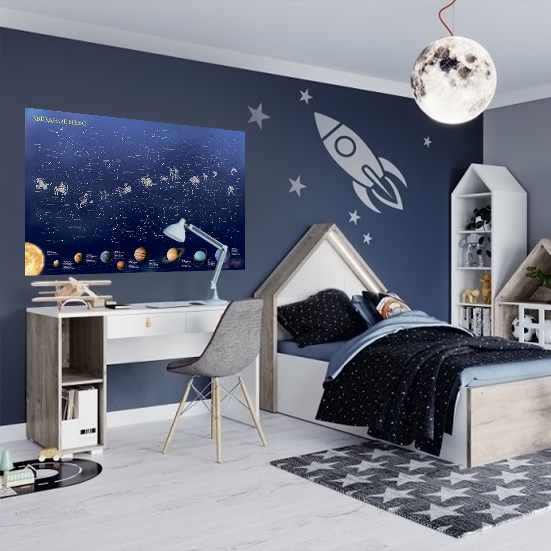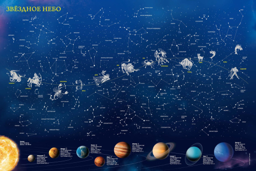 Перед вами необычная карта звёздного неба. Днём с ней можно исследовать очертания созвездий и названия ярчайших звёзд,а ночью же – просто наслаждаться звёздным сиянием. На карте отображены планеты по мере удаленности от Солнца, и изложена информация с краткими характеристиками каждой из них.
