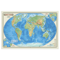 Физическая карта мира передает внешний облик суши и акваторий всей планеты в обзорном масштабе. На карте подробно отражены рельеф и гидрография, а также пески, солончаки, болота, вулканы, коралловые рифы, материковые льды и вечные снега, шельфовые ледники. Показаны значимые населённые пункты.