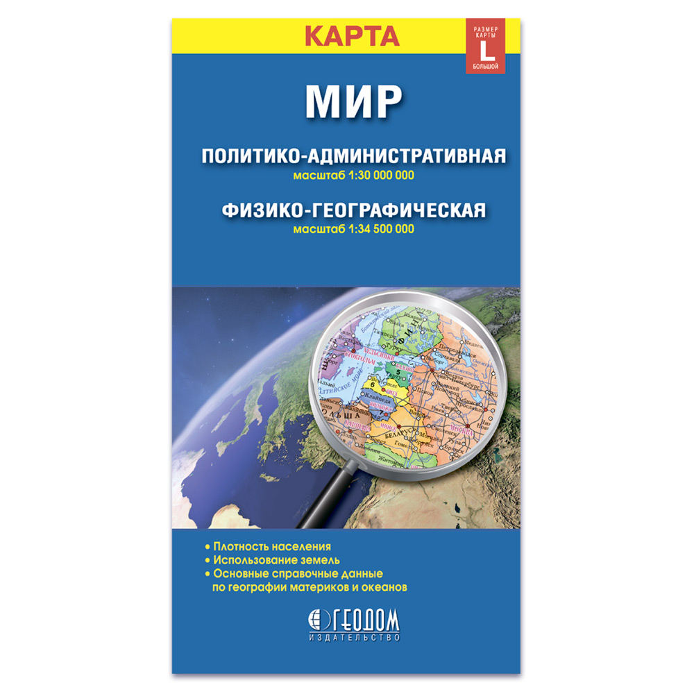 Карта МИР полит.+физич., 98х69 см, 1:30 млн/1:34,5 млн, СКЛАДНАЯ