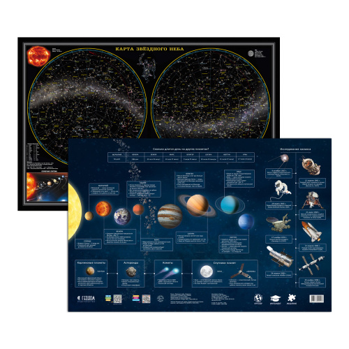 Карта ЗВЕЗДНОЕ НЕБО/Планеты, 58х38 см, ДВУХСТОР. настольная КАПС. ЛАМ.