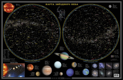 На карте звездного также отражена Солнечная система - Солнце и обращающиеся вокруг него небесные тела – 8 планет. Для более точного представления звездного неба даны таблицы характеристик планет, галактик, туманностей, самых ярких звезд и других космических объектов.