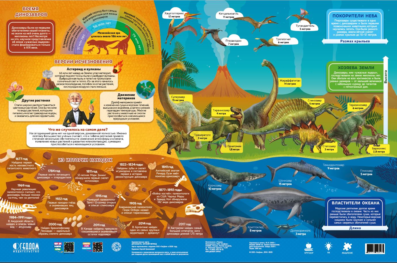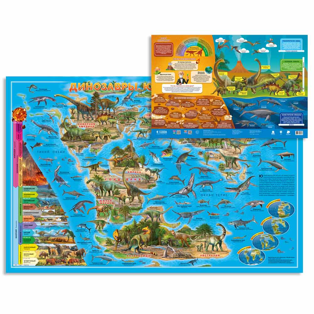 На оборотной стороне карты присутствует инфографика о том в когда и где на земле обитали динозавры, что привело к их исчезновению и ещё много полезной и интересной информации.