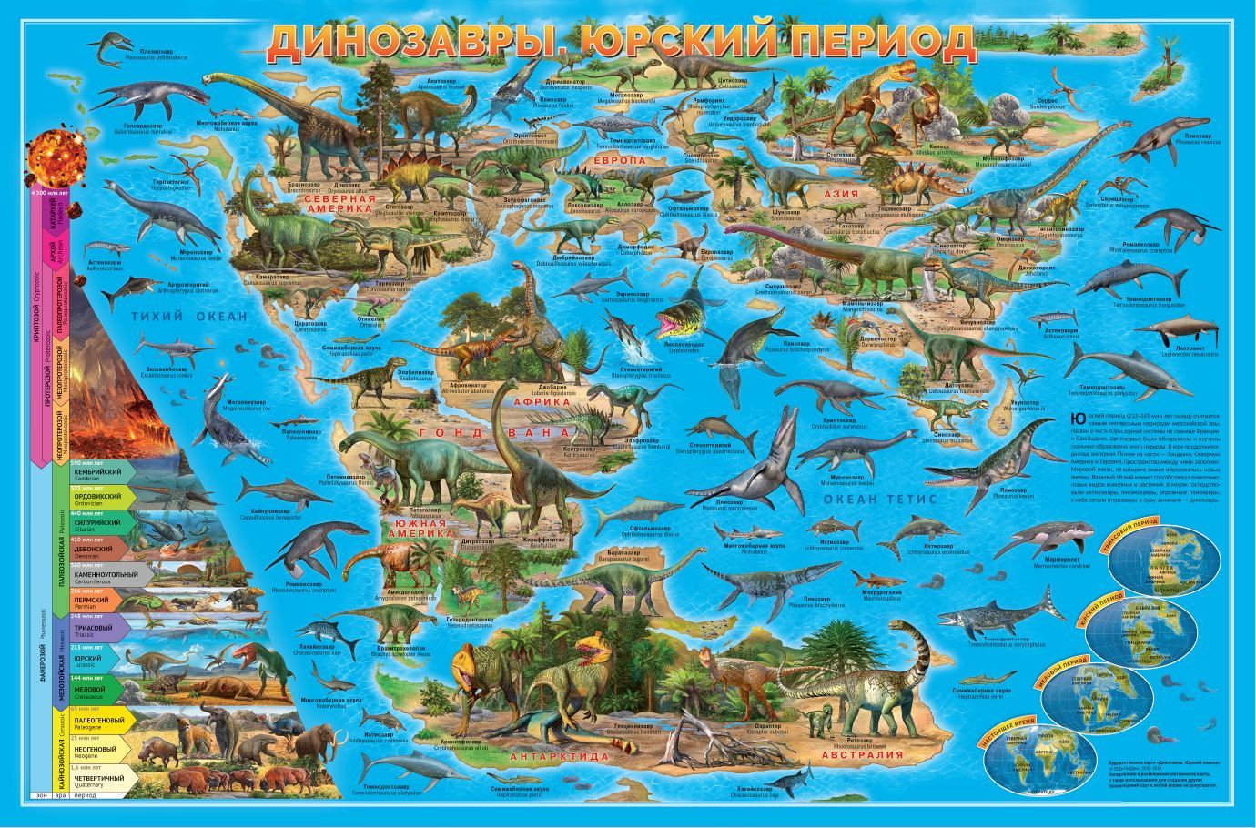 ДВУХСТОРОННЯЯ карта «Динозавры. Юрский период» наглядно иллюстрирует положение материков и представляет обитателей Земли во времена Юрского периода. Огромные и устрашающие динозавры, птерозавры, ихтиозавры, плиозавры – царили на Земле. Кроме того, на карте представлена схема континентального дрейфа и временная шкала истории Земли.
