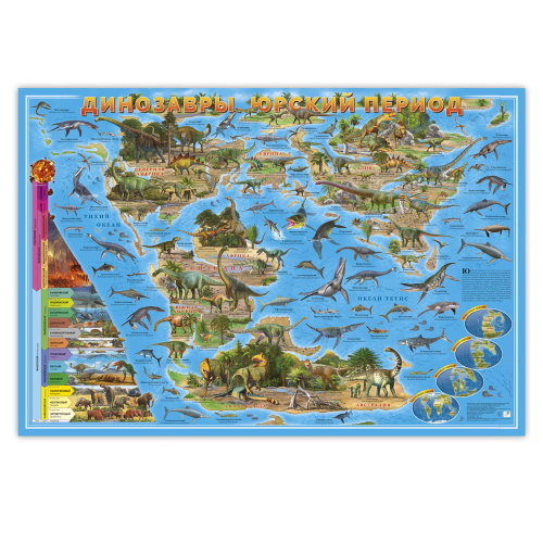 ДВУХСТОРОННЯЯЯ настольная карта «Динозавры. Юрский период» наглядно иллюстрирует положение материков и представляет обитателей Земли во времена Юрского периода. Огромные и устрашающие динозавры, птерозавры, ихтиозавры, плиозавры – царили на Земле. Кроме того, на карте представлена схема континентального дрейфа и временная шкала истории Земли.