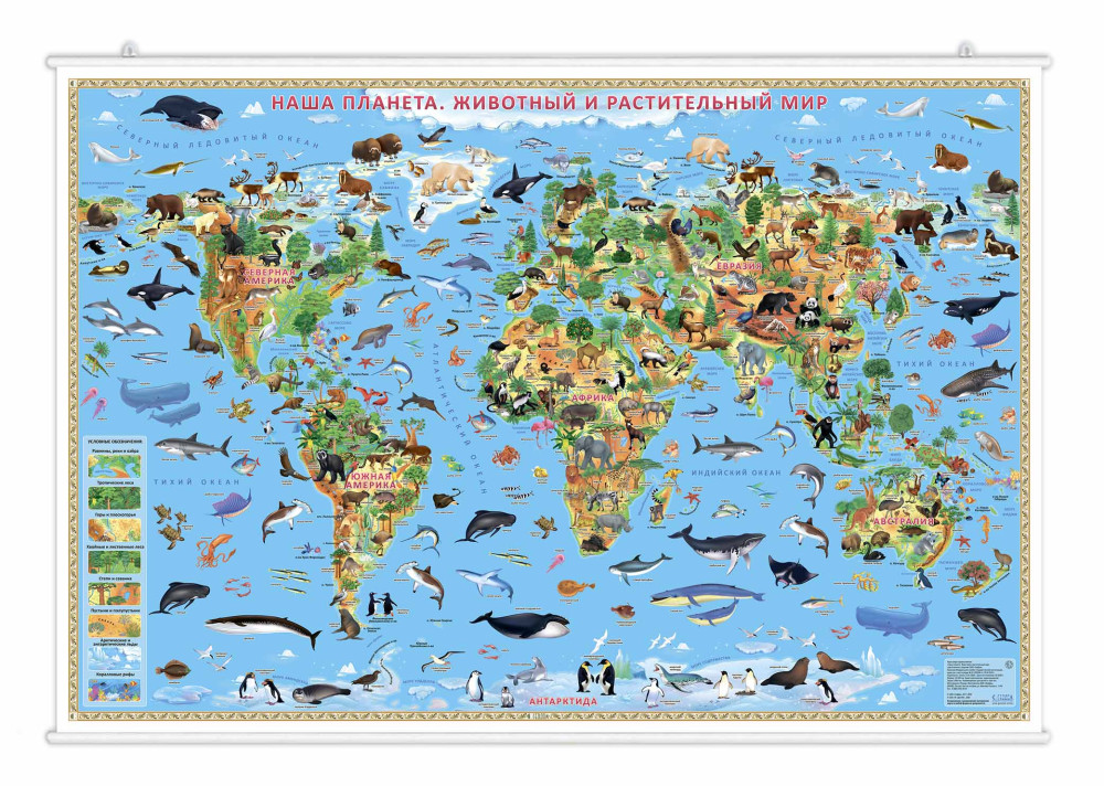 Эта настенная карта отлично подойдёт для первого знакомства ребёнка с многообразием животных, птиц, а также растений нашей планеты. Яркие и красочные иллюстрации увлекут на долгое время маленького исследователя, позволив в полной мере представить, как богата природа Земли. Карта закреплена на рейках,что позволяет разместить её на стене.