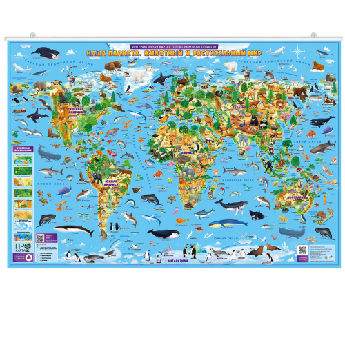 Пора изучать мир! «ПРОкарта. Наша планета. Животный и растительный мир» – это интерактивная карта с голосовым помощником, она подойдёт для детей старше 5 лет, но будет интересна и школьникам..К карте подготовлено обучающее видео «Простой способ понять карту» (его можно найти по QR-коду, который есть на каждой карте). Также с картой работает навык "ПРОкарта. Наша планета". Голосовой помощник Алиса поможет узнать очень много, будет задавать вопросы, давать подсказки и попросит найти на карте животных и растения. Яркая и красочная карта с голосовым помощником в удобном размере 101х69 см.– хороший подарок ребёнку от 5 до 10 лет. Карта закреплена на рейках, её легко разместить на стене. От повреждений и выцветания карта защищена ламинацией.