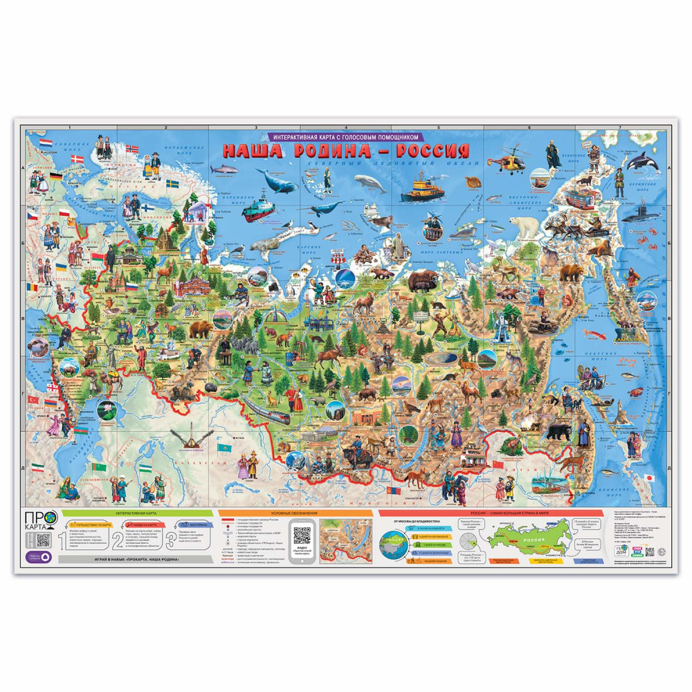 Пора изучать географию России! «ПРОкарта. Наша Родина - Россия» – это интерактивная карта с голосовым помощником, она подойдёт для детей старше 6 лет, но будет интересна и школьникам. К карте подготовлено обучающее видео «Простой способ понять карту» (его можно найти по QR-коду, который есть на каждой карте). Также с картой работает навык "ПРОкарта. Наша Родина". Голосовой помощник Алиса поможет узнать очень много, будет задавать вопросы, давать подсказки и попросит найти на карте географические объекты. Яркая и красочная карта с голосовым помощником в удобном размере 101х69 см– отличный подарок ребёнку от 6 до 12 лет. От повреждений и выцветания карта защищена ламинацией.