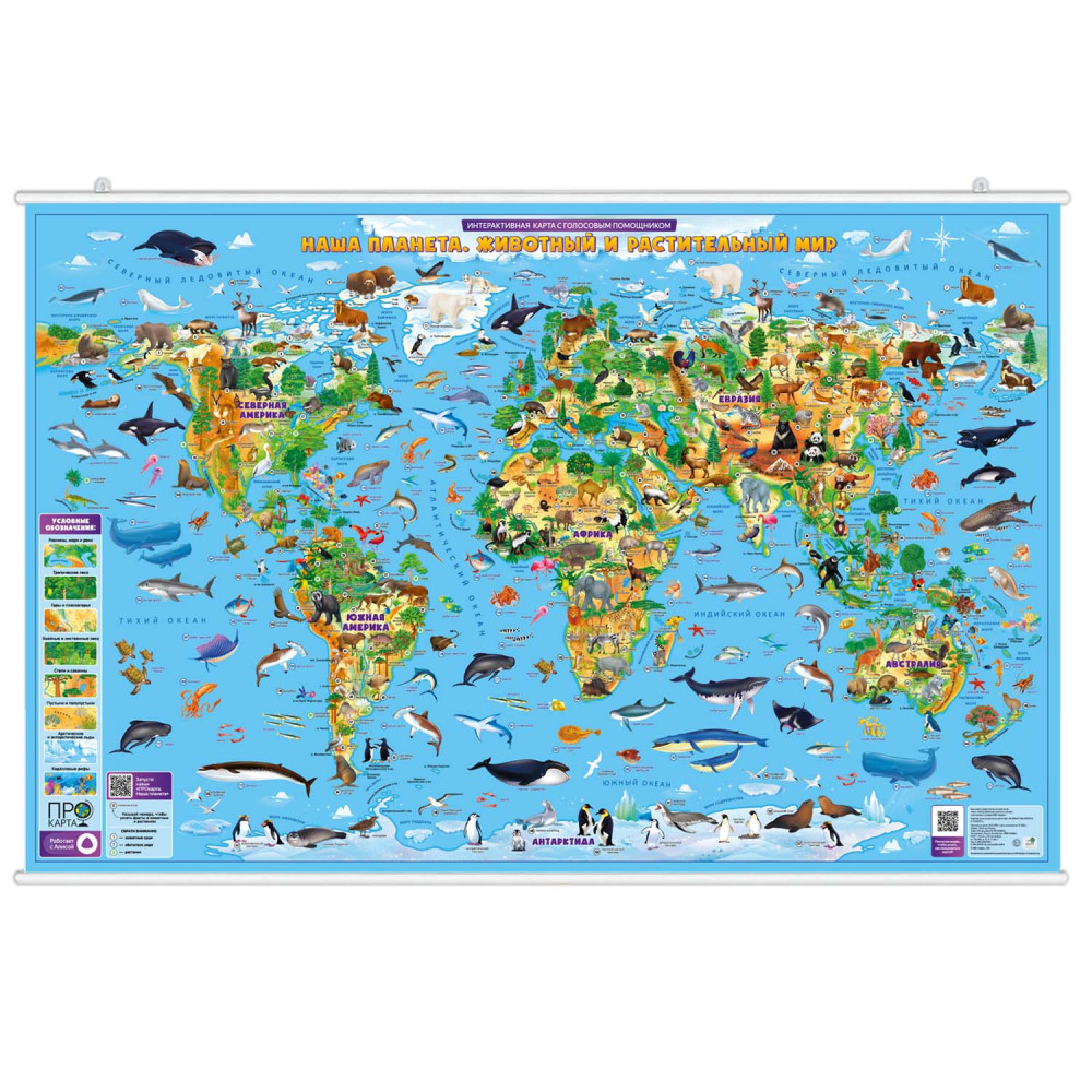 Пора изучать мир! «ПРОкарта. Наша планета. Животный и растительный мир» – это интерактивная карта с голосовым помощником, она подойдёт для детей старше 5 лет, но будет интересна и школьникам. К карте подготовлено обучающее видео «Простой способ понять карту» (его можно найти по QR-коду, который есть на каждой карте). Также с картой работает навык "ПРОкарта. Наша планета". Голосовой помощник Алиса поможет узнать очень много, будет задавать вопросы, давать подсказки и попросит найти на карте животных и растения. Яркая и красочная карта с голосовым помощником в удобном размере 124х80 см– хороший подарок ребёнку от 5 до 10 лет. Карта закреплена на рейках, её легко разместить на стене.