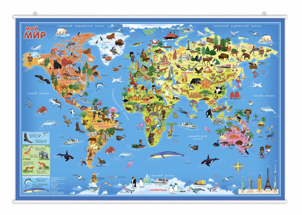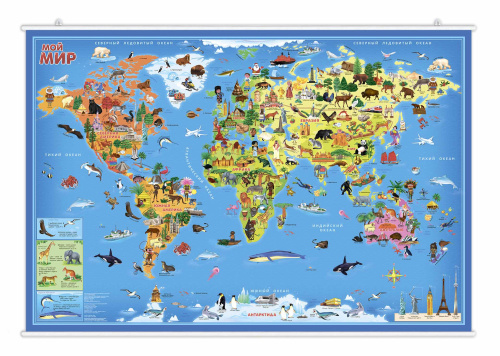 С большой настенной картой "Мой мир" от издательства "ГЕОДОМ" ребенок познакомится с миром вокруг, расширит кругозор. На карте изображены материки и океаны, животные и растения, а также достопримечательности со всех уголков нашей планеты. У карты оптимальный размер 101х69 см., а то что она закреплена на рейках, значительно упрощает размещение карты на стене. От повреждений и выцветания карта защищена ламинацией. Формат карты очень удобный, позволяет рассмотреть все детали. Карта станет замечательным украшением детской комнаты.