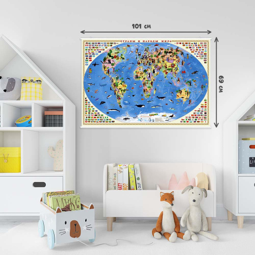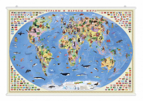 Познакомить ребенка с основами географии, политико-административным устройством мира, а также изучить названия и столицы государств поможет карта «Страны и народы мира». На карте даны красочные иллюстрации народов в их национальных костюмах, показаны самые узнаваемые достопримечательности некоторых стран, изображены флаги государств по расположению на континентах. У карты оптимальный размер 101х69 см., а то что она закреплена на рейках, значительно упрощает размещение карты на стене. От повреждений и выцветания карта защищена ламинацией.