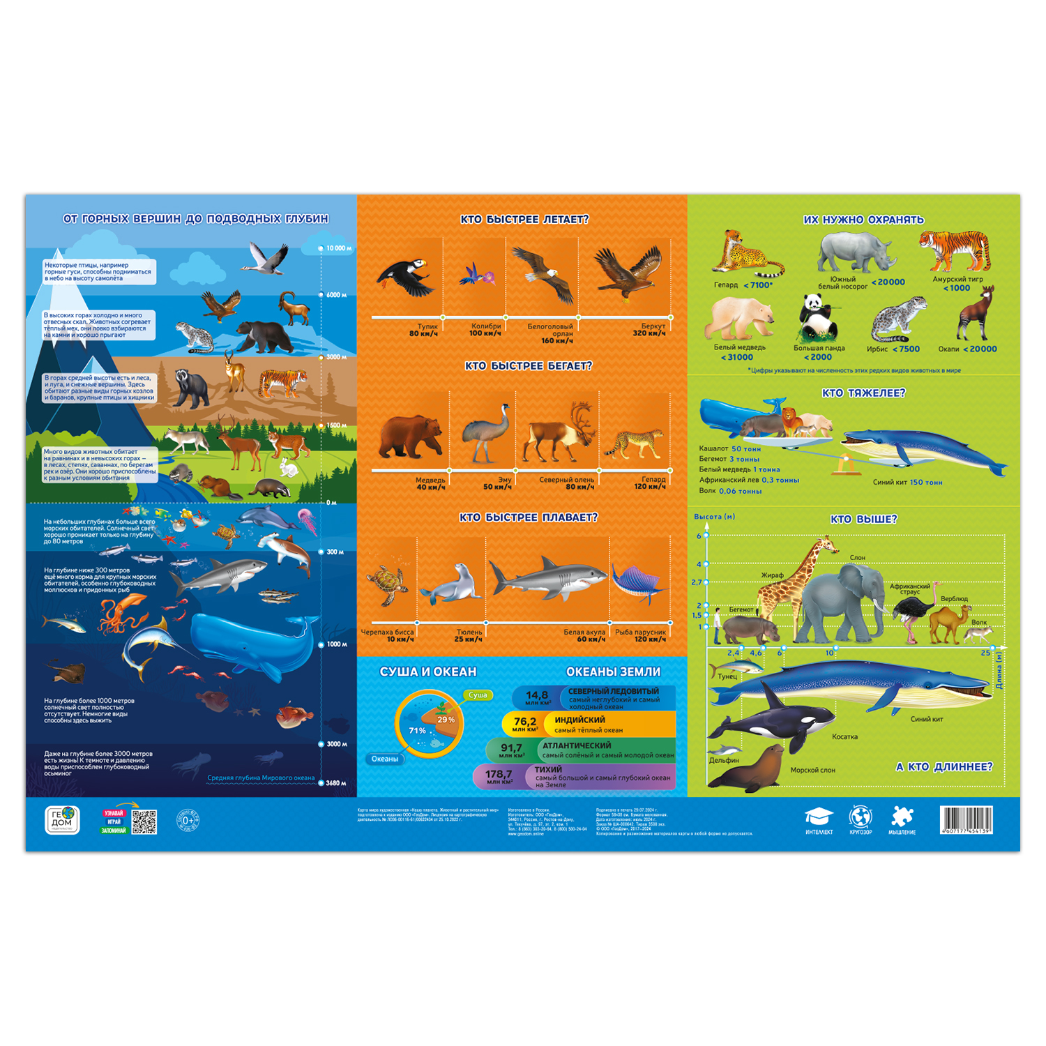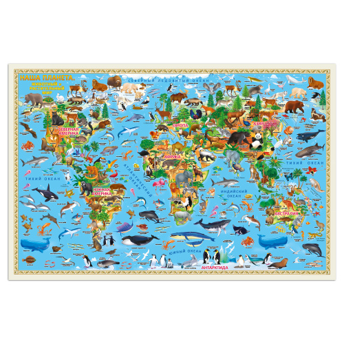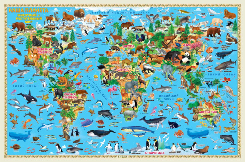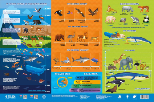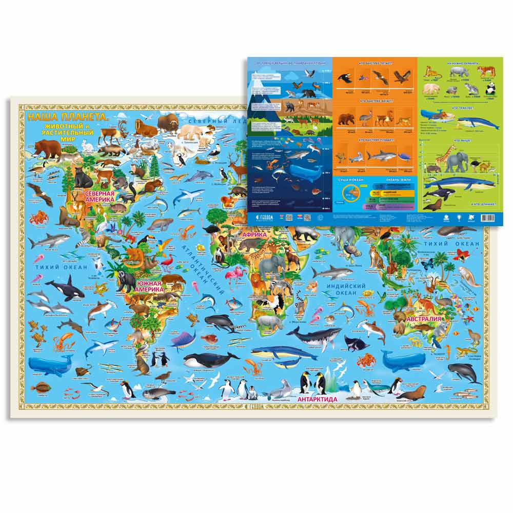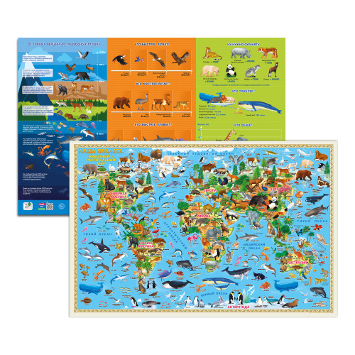 Эта ДВУХСТОРОННЯЯ настенная карта отлично подойдёт для первого знакомства ребёнка с многообразием животных, птиц, а также растений нашей планеты. Яркие и красочные иллюстрации увлекут на долгое время маленького исследователя, позволив в полной мере представить, как богата природа Земли. На оборотной стороне карты приведена инфографика, с её помощью дети узнают, какое животное самое быстрое на земле, а какое самое высокое и ещё много полезной и интересной информации.