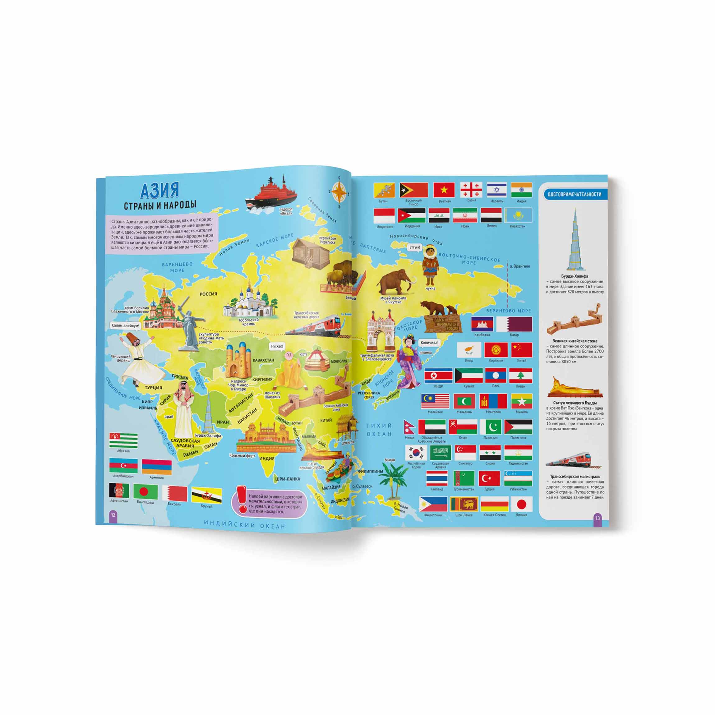 Новый детский Атлас Мира с наклейками - самый простой способ отправится в кругосветку, не выходя из дома. Вместе с командой юных путешественников, ребенок узнает много нового о растениях и животных, достопримечательностях, странах и народах мира. Детский атлас мира дополнен красочными иллюстрациями, картами и наклейками, с которыми изучение географии становится интересной игрой! Отправляйтесь в путь навстречу новым знаниям!