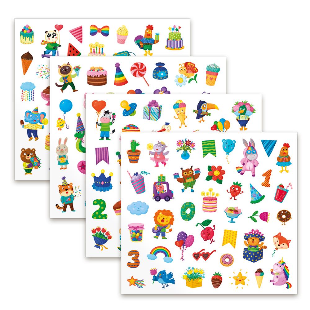 Воздушные шарики, сладости, флажки, добрые зверята, цифры и ещё много самых разных весёлых наклеек из этого набора украсят любые приглашения, открытки, письма, дневники, тетради или альбомы.